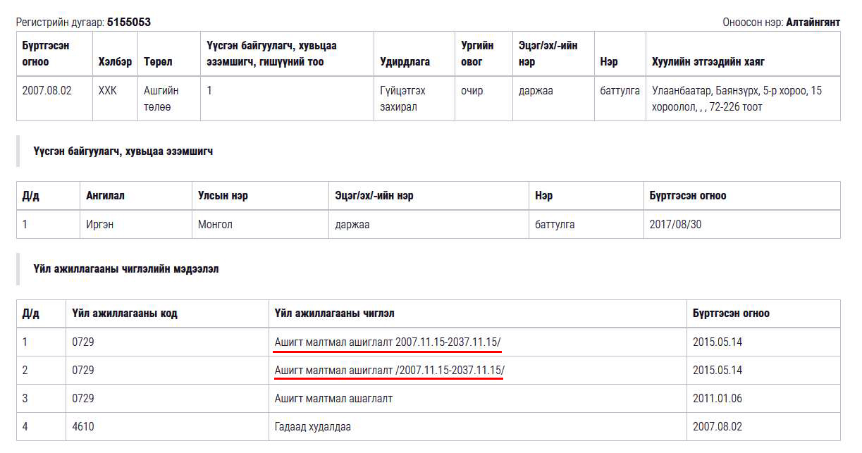 “Алтай Гоулд” компани хууль бусаар олж авсан лицензээ дахин сэргээлгэхээр Захиргааны хэргийн шүүхэд гомдол гаргалаа. Улмаар Нийслэлийн захиргааны хэргийн шүүхийн шүүгч Х.Батсүрэн шүүх хуралдааныг даргалан нэхэмжлэлийг хянан хэлэлцэж, уг асуудалтай төдийлөн холбоотой бус Ашигт малтмалын 8 дугаар зүйлийн 1 дүгээр хэсгийн 4 болон 5 дахь заалтыг үндэслэн “Алтай Гоулд” ХХК-д олгосон тусгай зөвшөөрлийг сэргээх шийдвэр гаргажээ.