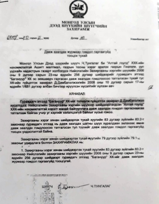 “Алтай гоулд” компанийн талд гарсан Нийслэлийн Захиргааны хэргийн шүүхийн 256 дугаар шийдвэрийг Дээд шүүхэд давж заалдах үед Багануур ХК-ийн гүйцэтгэх захирал Д.Дамбапэлжээгийн гарын үсэгтэй гомдлоосоо татгалзсан албан тоот ирүүлсэн ба үүнийг үндэслэж Ч.Тунгалаг шүүгч Багануур ХК-ийг давж заалдах гомдол гаргаагүйд тооцож шүүхийн шийдвэрийг “Алтай Гоулд”-ийн талд үлдээв.