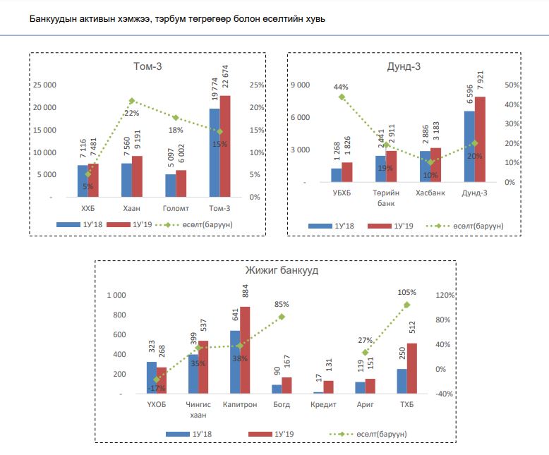 1 жилийн өмнөх мөн үетэй харьцуулахад ТОМ-3 банкны актив 14,7 хувь, ДУНД-3 банкны актив 20,1 хувь, жижиг банкуудын актив 44,1 хувиар тус бүр өсчээ.