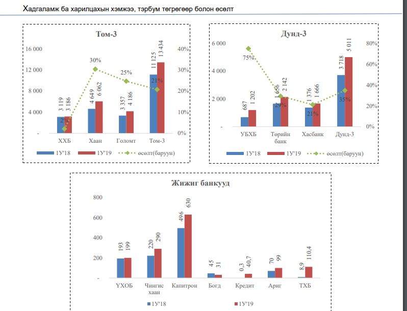 Өмнөх оны мөн үетэй харьцуулахад ТОМ-3 банкны ашиг 15 хувиар буюу 15 тэрбум төгрөгөөр буурч 81 тэрбум төгрөгийн ашигтай ажиллажээ. ДУНД-3 банкны ашиг өмнөх оны мөн үетэй харьцуулахад 11 тэрбум төгрөгөөр өсч 13 тэрбум төгрөгийн ашигтай ажиллажээ. Харин жижиг банкуудын хувьд 6 тэрбум төгрөгийн алдагдалтай ажиллажээ.