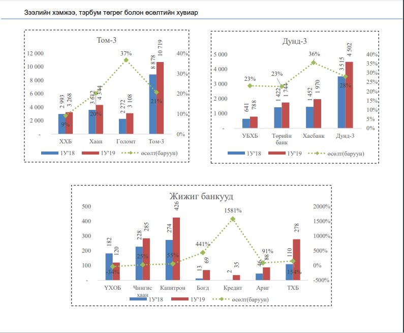 Өмнөх оны мөн үетэй харьцуулахад ТОМ-3 банк 20,7 хувиар, ДУНД-3 банк 28,1 хувиар, жижиг банкууд 52,2 хувиар тус тус зээлийн хэмжээгээ нэмэгдүүлжээ. Харин нийт дүнгээр авч үзвэл банкуудын зээлийн хэмжээ сүүлийн нэг жилд 24,7 хувь өсчээ.