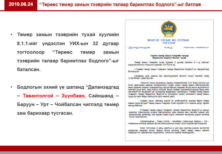 Хэдийгээр УИХ-аар Төмөр замын талаар баримтлах бодлогыг 2010 онд баталсан ч хөрөнгө мөнгийг нь шийдэж өгөлгүй олон жил алдсан. УИХ, Засгийн газрын танхим дотор энэ бүтээн байгуулалтыг зогсоох, ямар нэг байдлаар хорих хүмүүс бий. Дотоодын дайсан хүчтэй байна. Харин У.Хүрэлсүх, зарим сайд нар зориг гаргаж, хөрөнгө мөнгийг нь шийдэж өгсөнд баяр хүргэе.