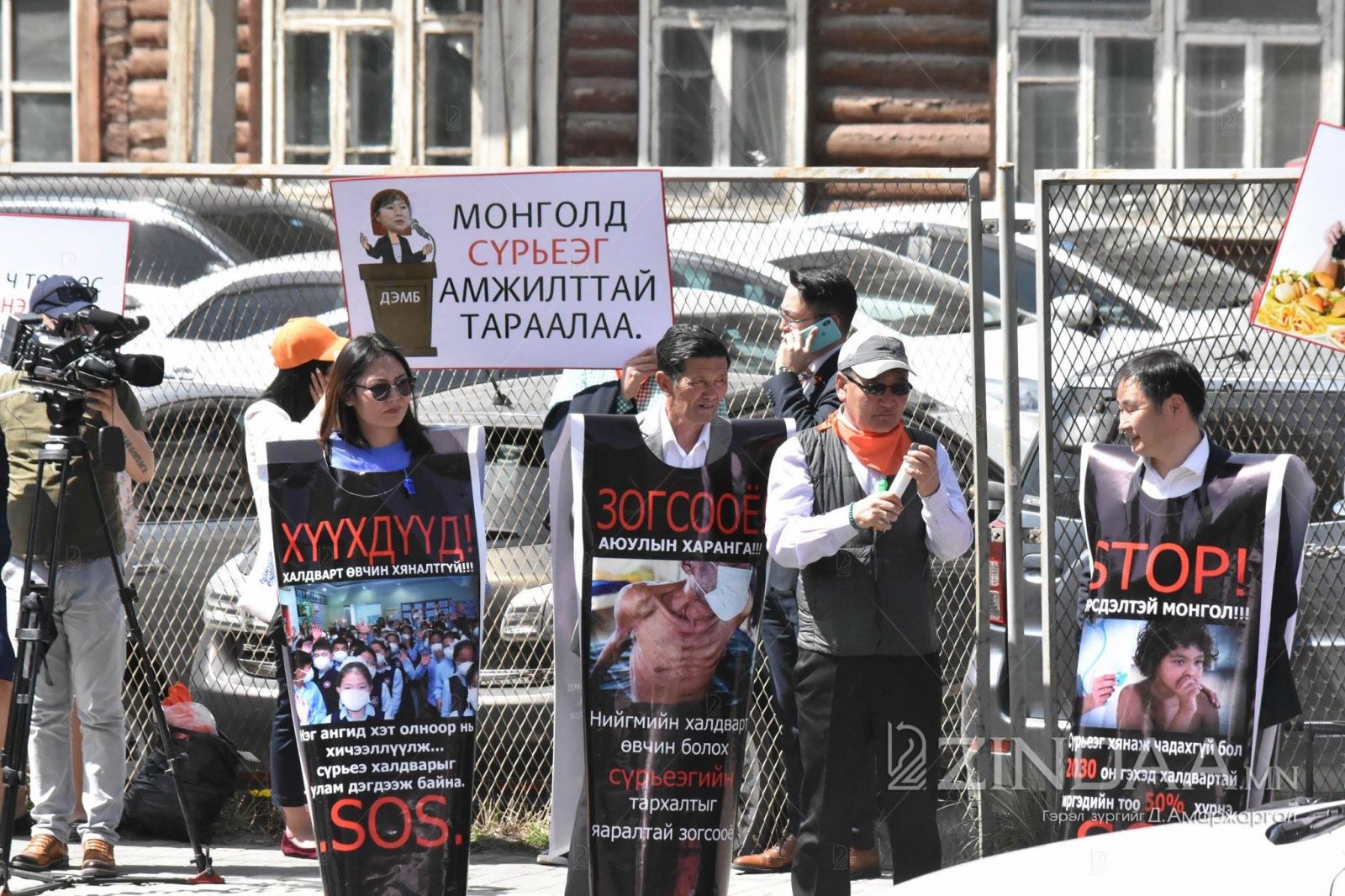 ЭМЯ-ны гадаа жагсагчид "Монголд сүрьеэг амжилттай тараалаа”, “Эрүүл мэндийн салбар сэхээнд байна”, “МАН-ын террорист сара”, “Сүрьеэ хяналтаас гарлаа”, “Эрүүл мэндийн сайд огцор” зэрэг утга бүхий уриа лоозонгууд барьсан байв. Тэд “Мэргэжлийн бус сайдтай учраас сүрьеэг ердийн өвчин мэтээр ярьж байна. Эрүүл мэндийн салбар өнгөрсөн хугацаанд олсон олон амжилтаасаа ухарч, өвчлөл нэмэгдэж байгаа тул салбарын сайд ёс зүйн хариуцлага хүлээж сайн дураараа огцрох ёстой” гэсэн лоозонгоор жагсаалынхаа зорилгыг тодорхойлж байгаа. Гэвч хэт зохион байгуулалттай, хувь хүний нэр хүндэд халдсан гэмээр хардлага дагуулсан иймэрхүү жагсаалууд эргэлзээ төрүүлж байна. Сайд байна уу, хэн байна уу зориудаар хэн нэгэн хүн өвчин тараагаад сууж байдаг бол "гайхамшигтай" үйл явдал болно. Эцэг, эхчүүд сандарч болно, жагсаж болно. Гэхдээ ийм увайгүй, утгагүй, дүгнэлтгүй, хэт нэг талыг барьсан энэхүү жагсаалын "харагдах байдал" нь "Хэний явуулга вэ" гэж хардахаас аргагүй нөхцөл байдалд өөрөө хүргэж байна.