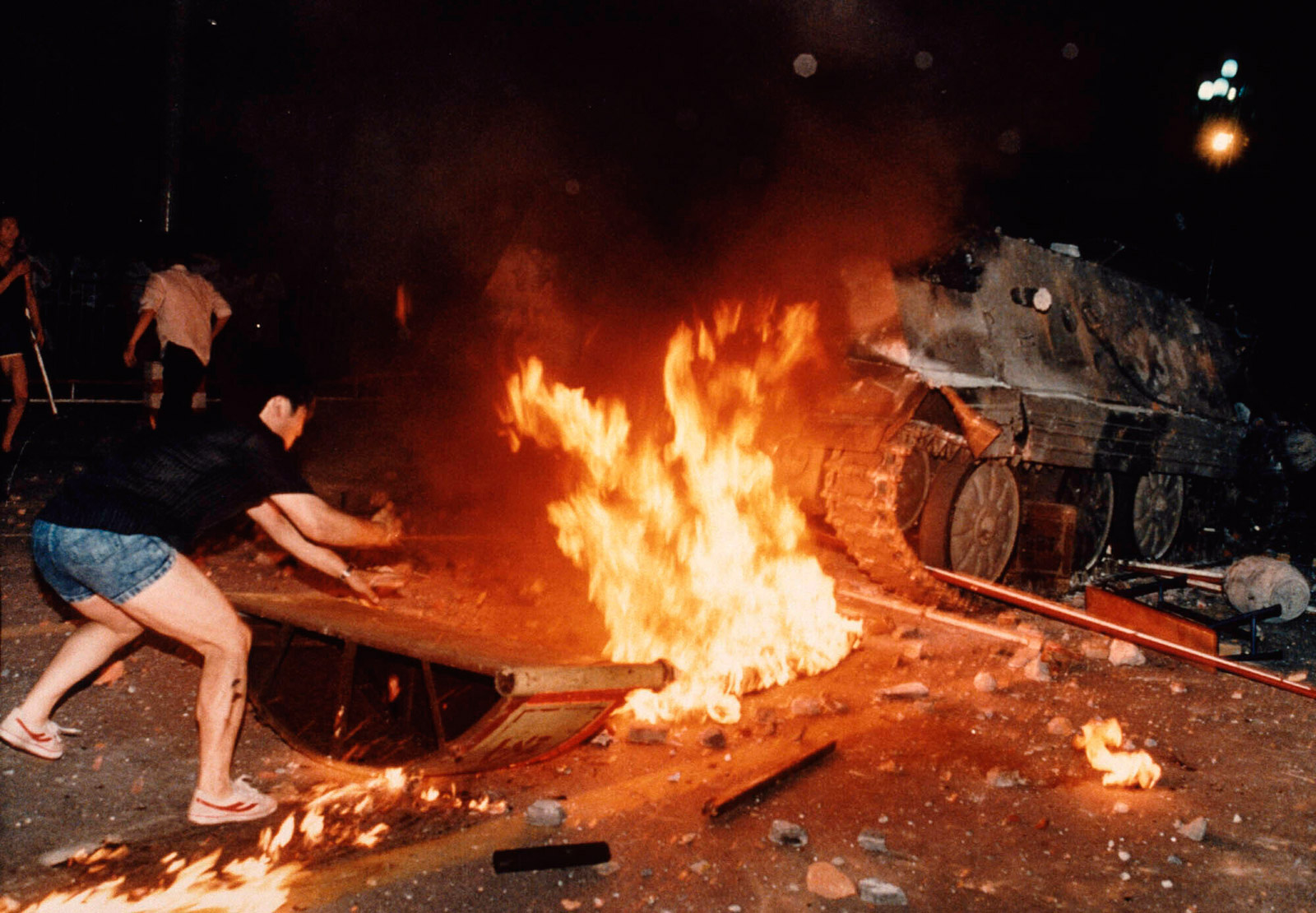 Аюулгүй байдлын хүчнийхэн хүмүүсийг гудамжинд гаргахгүй байсан бөгөөд тагтан дээрээс зөвхөн цэрэг орж ирж буй нь харагдаж байсан гэнэ. Жагсагчдын зарим нь хуягт техник руу шатах бодис бүхий лонх шидэж байжээ. Тухайн үед Бээжинд шатахууныг хатуу хяналт дор зөвхөн зөвшөөрлийн бичгээр олгодог байсан тул жагсагчид шатахуун чөлөөтэй авч, шатах зүйл бүхий лонх өөрсдөө бэлтгэж чадахгүй байсан болов уу гэж Hidden Harmonies China Blog сонинд бичсэн байдаг. Улангассан жагсагчид шатаж буй машинаас гарч ирсэн цэргүүдийг хөнөөж, зарим цэргүүдийг дүүжилсэн гэсэн мэдээлэл бий.