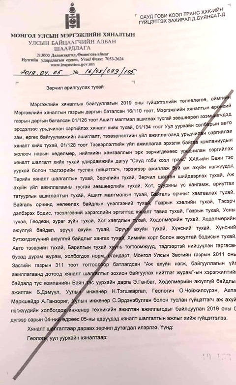 Тус аймагт үйл ажиллагаа явуулж байгаа “Саудгоби коэл транс” ХХК нь уул уурхайн олборлолт, ашиглалт, тээвэрлэлтийн үйл ажиллагаандаа Монгол Улсын хууль тогтоомж, стандартыг дагаж мөрддөггүй, алхам тутамдаа зөрчиж, хүн ам, нийгэм, эдийн засаг, байгаль экологид ноцтой хохирол учруулж байна. Энэ талаар танай байгууллага холбогдох шалгалт явуулан “Саудгоби коэл транс” ХХК нь геологи, уул уурхай, байгаль орчин, хөдөлмөрийн болон эрүүл ахуй, авто тээврийн хяналтын талаар тогтоосон хэм хэмжээ, стандарт шаардлагыг олон талаар зөрчсөн асуудлыг шалгаж тогтоон 2019 оны дөрөвдүгээр сарын 05-ны өдөр 16/05/ 089/105 тоот “Зөрчил арилгуулах тухай” мэргэжлийн хяналтын улсын байцаагчийн албан шаардлагыг хүргүүлж байжээ.