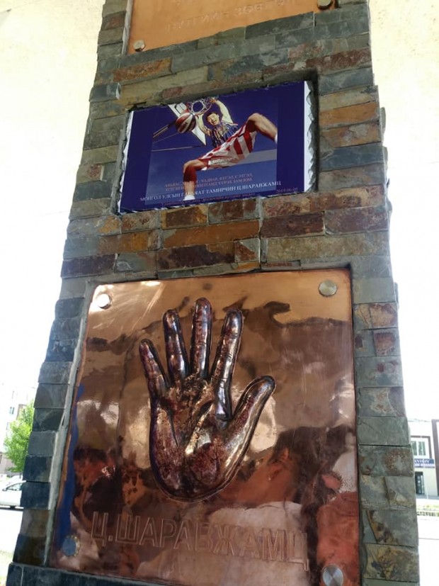 Алдартнуудын баганы анхдагчаар Монгол Улсын Гавьяат тамирчин Г.Шаравжамц, Ж.Нарантунгалаг нарыг тодруулсан бөгөөд тэдний гарын алга, нударганы хэвийг аранжин зэсэнд оршоож, нутгийн боржин чулуугаар 108 үелэж бүтээсэн багананд мөнхөлжээ.