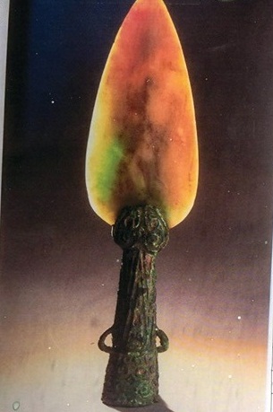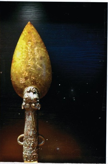 Аман хэлэнд “Гүүгэн” гээд яригддаг Бээжин хотын хааны ордонд үүнтэй ижил, жижигхэн (18,4 см х 4,9 см)-ын харьцаатай мөн л хас гилбэр зуусан чонотой, бичиггүй гилбэр хадгалагдаж байгааг олж үзэв. “0240” дугаартай үнэт үзмэр нь ажээ... (зураг 5)