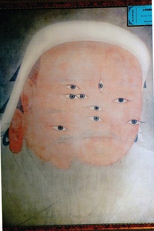 ӨМӨЗО-ны алдартай цуглуулагч Чингистэй, Нууц товчоотой холбоотой, ихээхэн зүйл хуримтлуулсан дэлхийн энтэй цуглуулга хийсэн Балжинням гэдэг хүн, насаараа цуглуулсан зүйлсээ Шилийн хотын нэгэн сургуульд шилжүүлсэн байх юм. Дэлхий дахинд хэвлэгдсэн номын цуглуулга, зураг, онго, тамга, бэлэг дурсгалын бүтээл олон байна. Би нэгэн зурагтай нүд харгав. (зураг 6) Чингис хааны эш хөргийг хуулан зурахдаа өрөөсөн нүдийг нь тас аниулан зуржээ... Нөгөө нэгэн зураг дээр (зураг 7) мөн Чингисийн эш хөргөн дээр “есөн нүд” тараан байрлуулж зуржээ... Уран зургийн ертөнцөд янз бүрийн эрэл эгээрэл байж болно л доо! Би уран зургийг төгс ойлгодоггүй ч ойлгох гэж өөрийн чинээндээ “зүтгэдэг” нэгэн... Энэ зургуудыг удаан харлаа... Уншигч танд үзүүлэх гэж зургийг нь авахууллаа. Алдарт зураач Леонардо да Винчын “Жоконда”-д нүдний шил зүүлгэж, рок дуучин шиг баахан зүүлт бөгж зүүлгэн фото зохиомж хийж, “дотоож сэмбэн” /бидний ярьдаг футболк, буфайк/ гэгч цамцан дээр буулган хийсэн байхыг, хүмүүс өмсч явахыг Америк, Италид үзэж л байсан...