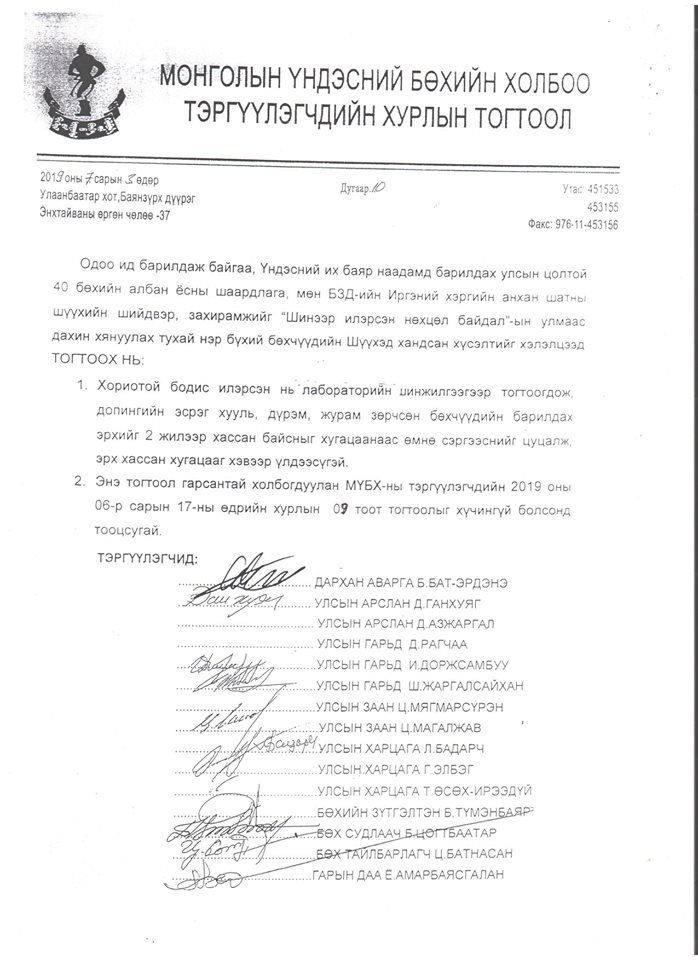 Тиймээс бөхчүүдийн дунд маргаан үүсгээд байсан асуудал нэг талд шийдэгдэж, допинг хэрэглэсэн бөхчүүд шийтгэлээ бүрэн эдэлсний дараа буюу гурван сарын дараагаас барилдах эрхтэй болох нь.