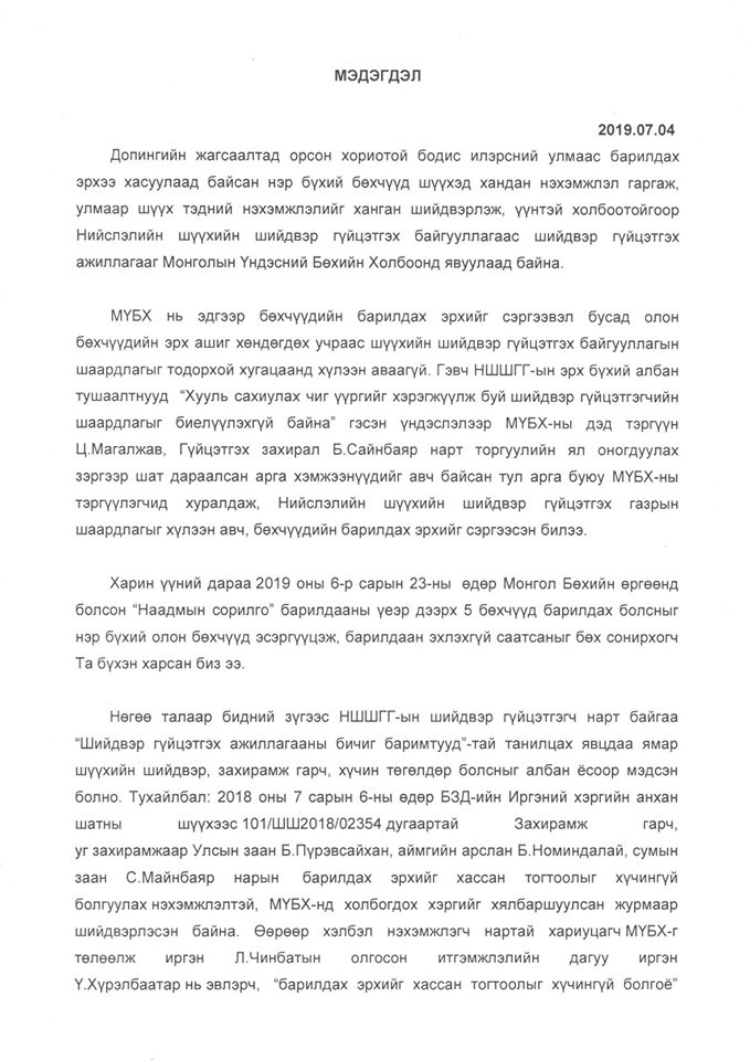 Ү.ХҮРЭЛБААТАР НААДМЫН ӨМНӨ ХЭДЭН ТӨГРӨГ ХАЛААСАЛСНАА УВС, ХОВДЫН ДОПИНГЧДОД БУЦААЖ ӨГӨХ ХЭРЭГ ГАРАХ НЬ ЭЭ. САНЖАА АВАРГА ЗӨВ ХӨДӨЛСНИЙ АЧААР ШУДАРГА ШИЙДВЭР ГАРЛАА. БАТ-ЭРДЭНЭ АВАРГА БАС Л БӨӨРӨНХИЙЛСӨН ЮМ ЯРИАД СУУЖ БАЙСАН. ЯАНА ДАА