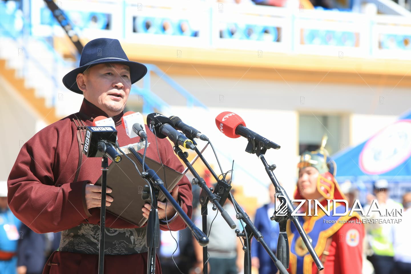 Өнөөгийн Та бидэнд тусгаар тогтнол, түүх соёлоо ямагт зүрхэн толт, нүдний цэцгий мэт эрхэмлэн хайрлаж явах түүхэн үүрэг буйг Монгол наадам маань сануулж байна. Бүрэн эрхт, тусгаар Монгол Улс байгаа цагт үндэсний их баяр наадам маань мөнх орших болно. Их эзэн, эцэг дээдэс Чингис хаан минь ээ. Хүлэг морьд чинь хурдан байна, хүчит бөхчүүд чинь мэхтэй байна, харваачид чинь мэргэн байна. Эх нутаг, элгэн садан монголчуудаа үеийн үед дээд тэнгэрээс ивээгээрэй. Мөнх тэнгэрийн ивээл дор Монгол наадам эхэллээ” гэв.