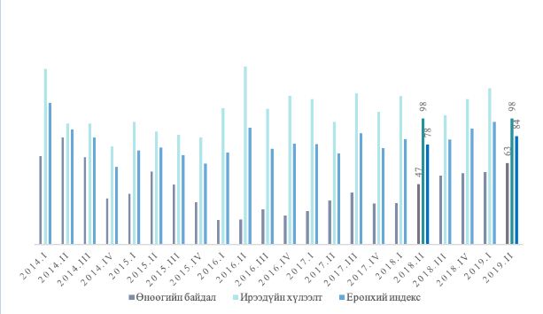ХИИ-ийн хоёрдугаар улирлын өөрчлөлтөд түүний бүрэлдэхүүн хэсэг болох өнөөгийн байдлын индексийн өсөлт нөлөөлжээ. Тухайлбал, өнөөгийн байдлын индекс жилийн хугацаанд 16.5 (35.2%) пунктээр өсөж 63.4 болжээ. Харин ирээдүйн хүлээлтийн индекс өмнөх оны мөн үеийн түвшинд буюу 98 байна. Өнөөгийн байдлын индексийн өсөлтөд ажлын олдоц (32.9 пункт) нь нөлөөлжээ. Ойрын ирээдүйд буюу ирэх зургаан сарын хугацаанд эдийн засгийн байдал ямар байх талаар өрхийн хүлээлтэд ажлын олдоц сайжирна (18.2 пункт) гэсэн хүлээлт эерэг нөлөө үзүүлсэн бол бизнесийн нөхцөл болон өрхийн санхүүгийн байдлын талаарх хүлээлт сөрөг нөлөө үзүүлсэн байна. Тухайлбал, бизнесийн нөхцөл (-13.5 пункт) болон орлогын (-4.4 пункт) хүлээлтийн индекс өмнөх оны мөн үеэс буурчээ.