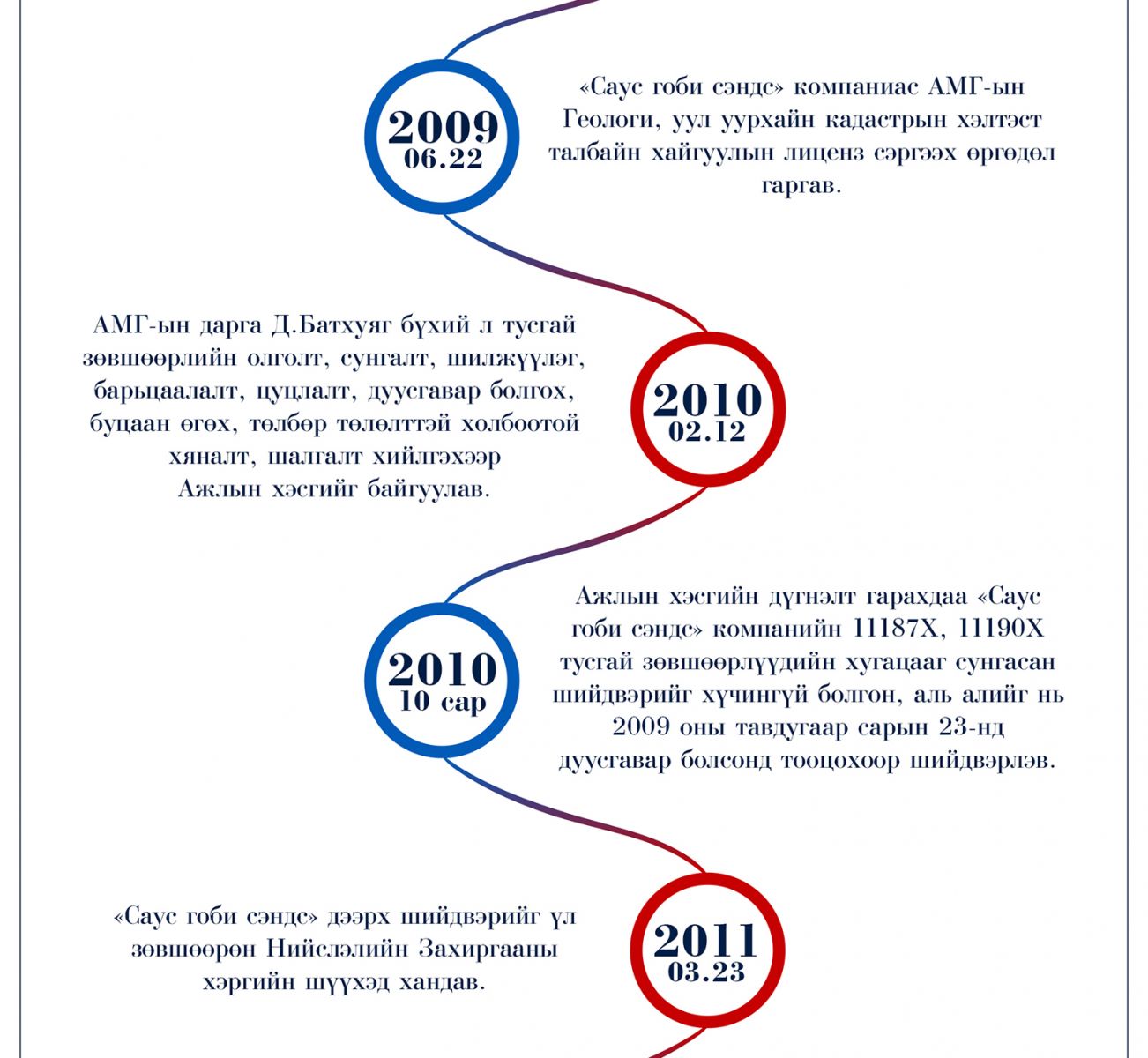 Гол нь “Саус гоби сэндс”-ийн хүсэлтийг АМГ шийдвэрлэж өгсөн нь хууль зөрчсөн болох нь нэг жилийн дараа тодорхой болсон байдаг. Ашигт малтмалын газрын даргаар ажиллаж байсан Д.Батхуяг Геологи, уул уурхайн кадастрын хэлтсийн фондод хадгалагдаж байгаа бүхий л тусгай зөвшөөрлийн олголт, сунгалт, шилжүүлэг, барьцаалалт, цуцлалт, дуусгавар болгох, буцаан өгөх, төлбөр төлөлттэй холбоотой хяналт, шалгалт хийлгэхээр Ажлын хэсгийг 2010 оны хоёрдугаар сарын 12-нд байгуулжээ. Сонирхолтой нь хууль бус шийдвэр гаргах чиглэл өгсөн Л.Даваацогт Ажлын хэсгийг ахалж, чиглэлийг нь ажил хэрэг болгосон Статистикийн тасаг, Эрх зүй, хуулийн тасгийн дарга нар нь ажлын хэсэгт нь багтсан байдаг. Ажлын хэсгийн дүгнэлт найман сарын дараа гарахдаа “Саус гоби сэндс” компанийн 11187Х, 11190Х тусгай зөвшөөрлүүдийн хугацааг сунгасан шийдвэрийг хүчингүй болгон, аль алийг нь 2009 оны тавдугаар сарын 23-нд дуусгавар болсонд тооцох ёстой гэсэн шийдвэр гарч байжээ. Харин “Саус гоби сэндс” үүнийг үл зөвшөөрөн Нийслэлийн Захиргааны хэргийн шүүхэд 2011 оны гуравдугаар сарын 23-нд хандсан бөгөөд шүүх компанийн талд шийдвэр гаргаж, АМГ-ын шийдвэрүүдийг хүчингүй болгосон түүхтэй. Нэг зүйлийг тодотгоход, “Саус гоби сэндс” компанитай холбоотой Захиргааны хэргийн шүүх дээр очсон маргаануудыг Б.Хажидмаа гэж шүүгч дараалан компанийн талд шийдвэрлэж байсан нь анхаарал татдаг.