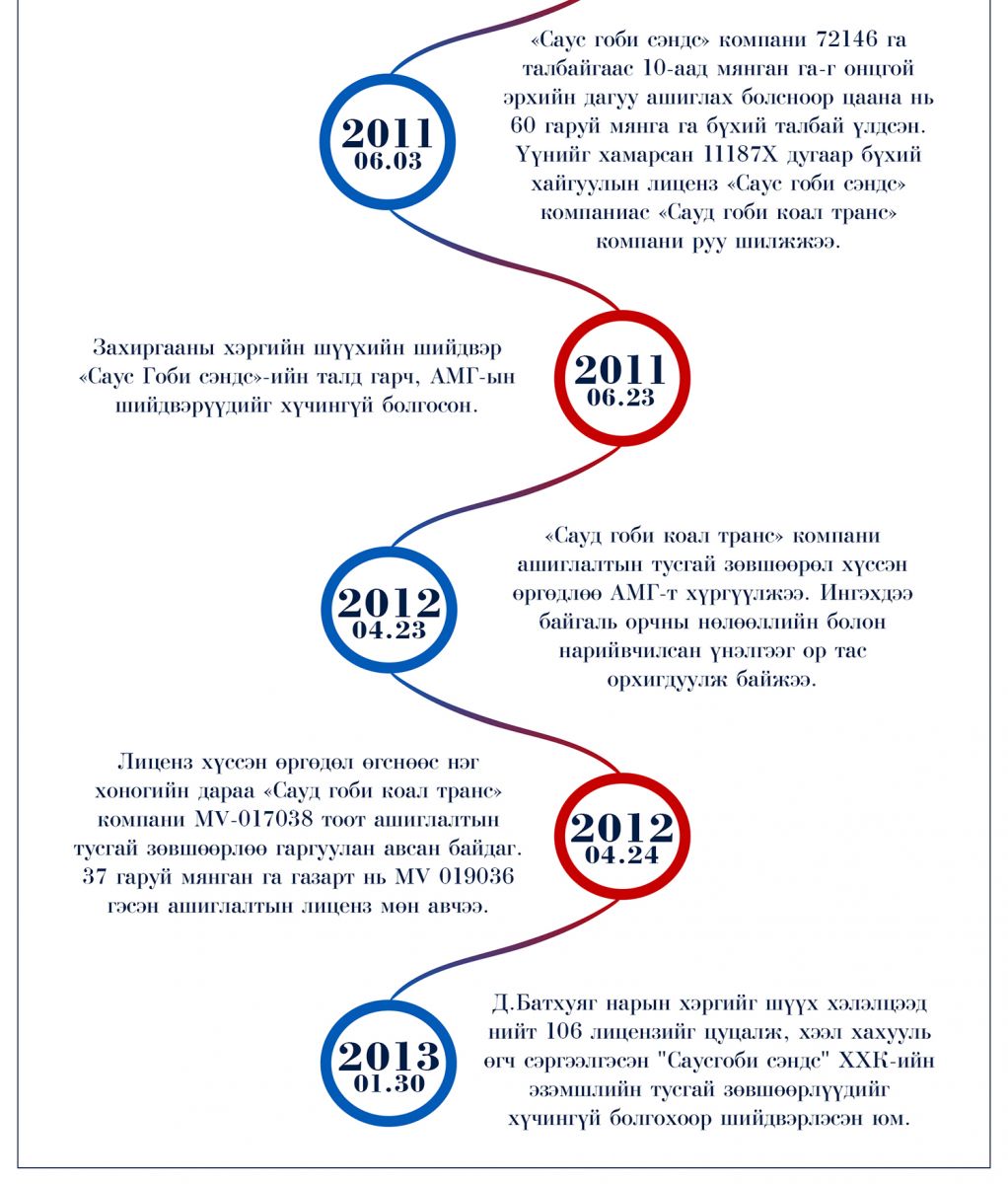 Хэдийгээр Д.Батхуяг, Л.Даваацогт нарын хууль бус үйлдэл олон арван лицензтэй холбогддог ч “Саус гоби сэндс”-ийн авлигын асуудал жин дарж байсныг сануулъя. Шүүхийн шийтгэх тогтоолд ч “Саус гоби сэндс”-ийн лицензтэй холбоотой асуудлыг дээрх байдлаар тодотгосон байгаа юм.
