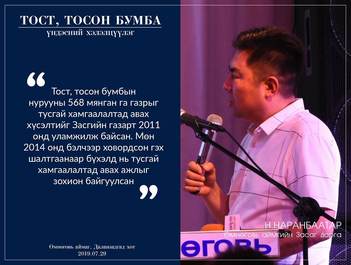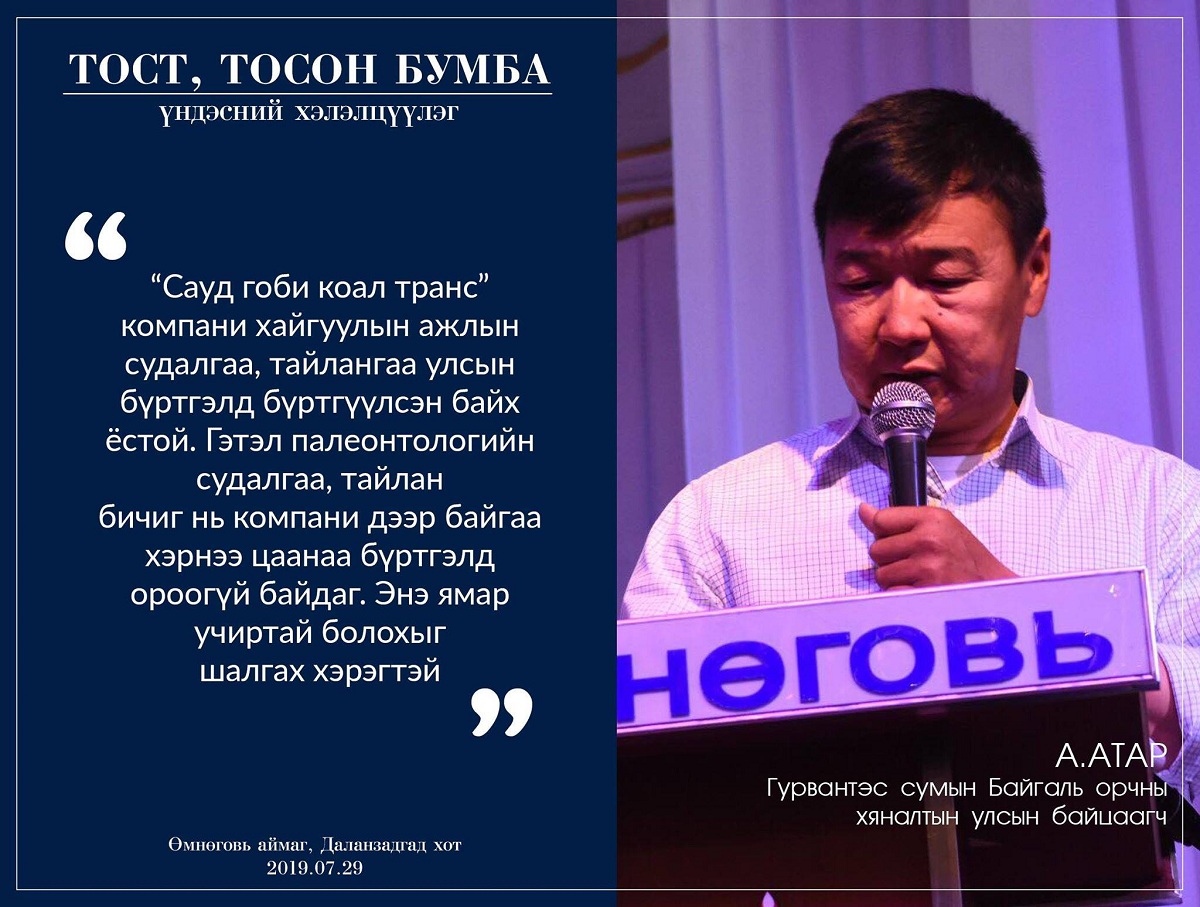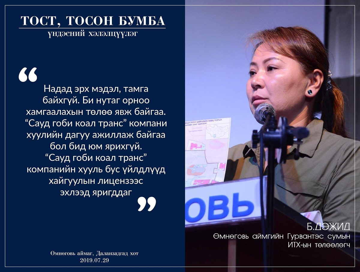 “Эрс шинэчлэл хөдөлгөөн”, “Байгаль хамгаалах говийн иргэдийн санаачилга” төрийн бус байгууллага хамтран зохион байгуулж буй цуврал хэлэлцүүлгийн анхан шатны хэлэлцүүлэг өнөөдөр /2019.07.29/ Өмнөговь аймгийн төв Даланзадгад хотод болж байна. Хэлэлцүүлэгт Өмнөговь аймгийн засаг дарга Н.Наранбаатар, “Байгаль хамгаалах говийн иргэдийн санаачилга” ТББ-ын тэргүүн сэтгүүлч Х.Мандахбаяр, “Сауд гоби коал транс” компанийн төлөөлөл болон орон нутгийн иргэд, иргэний хөдөлгөөний төлөөллүүд оролцож, Гурвантэс сум, Тост, тосон бумбын нурууг хамгаалах асуудлыг хэлэлцэж байна.