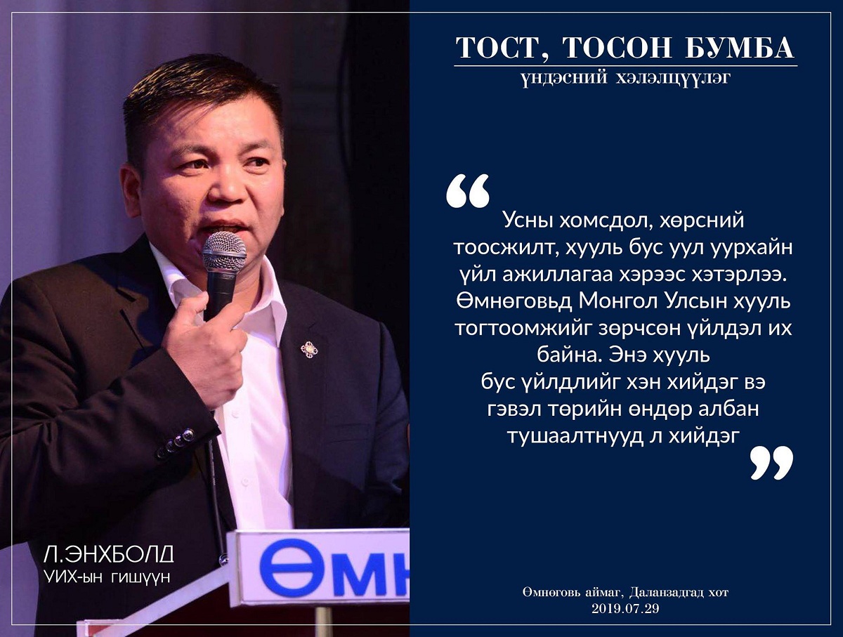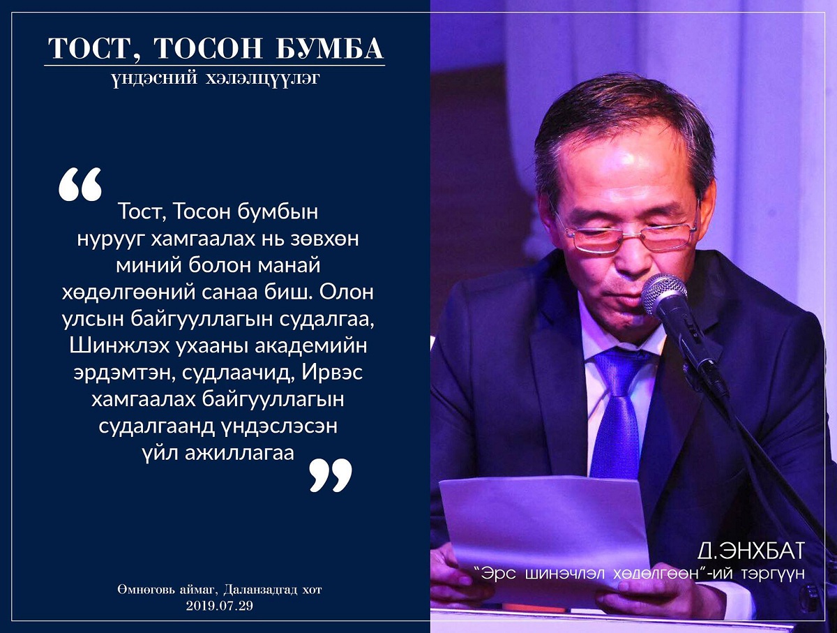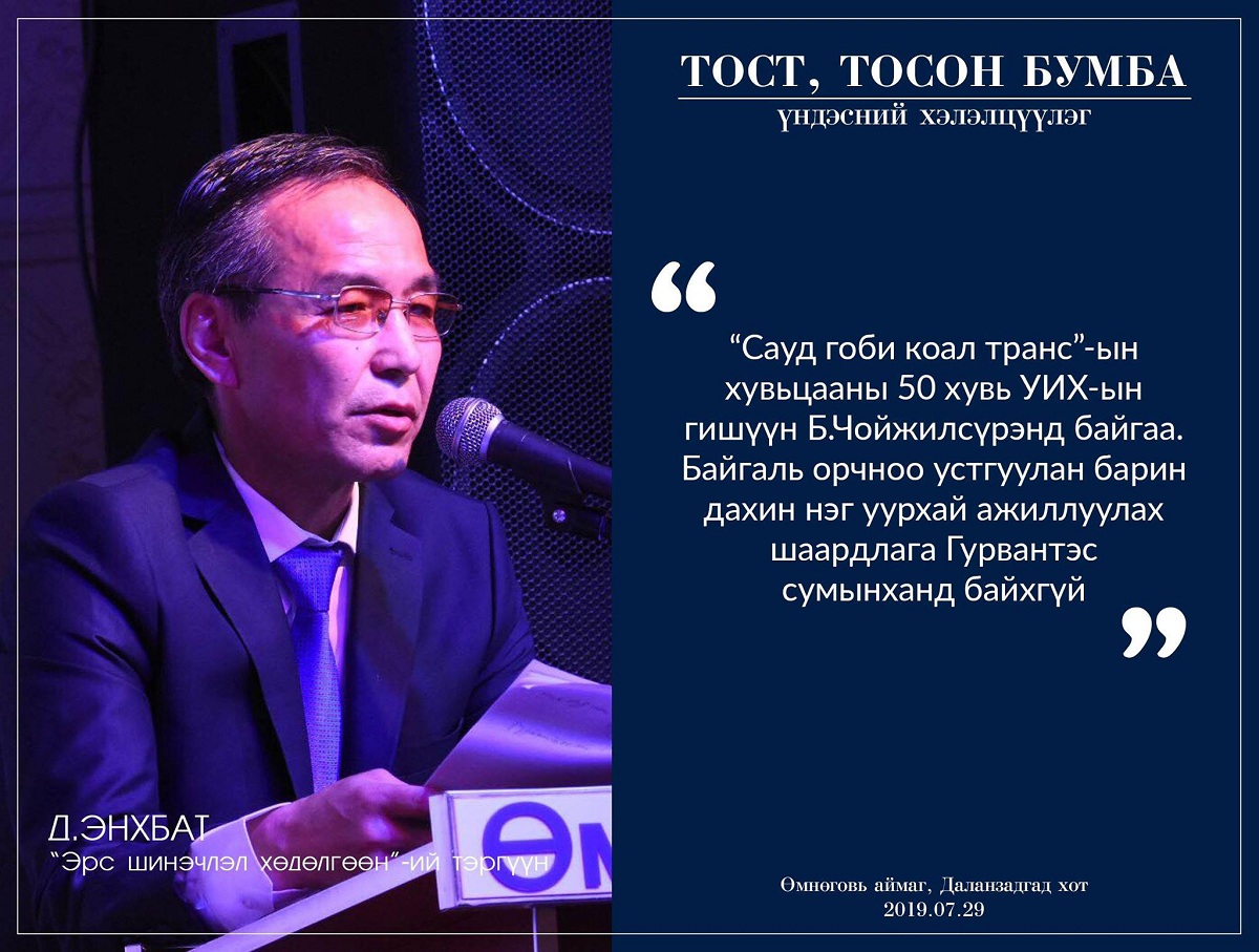 “Эрс шинэчлэл хөдөлгөөн”, “Байгаль хамгаалах говийн иргэдийн санаачилга” төрийн бус байгууллага хамтран зохион байгуулж буй цуврал хэлэлцүүлгийн анхан шатны хэлэлцүүлэг өнөөдөр /2019.07.29/ Өмнөговь аймгийн төв Даланзадгад хотод болж байна. Хэлэлцүүлэгт Өмнөговь аймгийн засаг дарга Н.Наранбаатар, “Байгаль хамгаалах говийн иргэдийн санаачилга” ТББ-ын тэргүүн сэтгүүлч Х.Мандахбаяр, “Сауд гоби коал транс” компанийн төлөөлөл болон орон нутгийн иргэд, иргэний хөдөлгөөний төлөөллүүд оролцож, Гурвантэс сум, Тост, тосон бумбын нурууг хамгаалах асуудлыг хэлэлцэж байна.