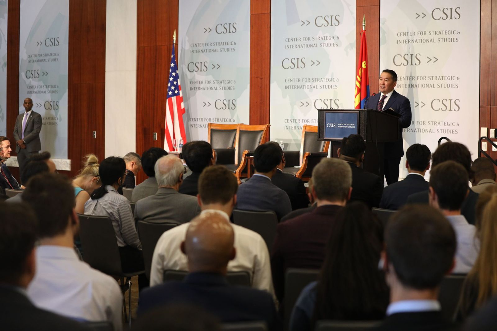 “Эрхэм хүндэт Ноён Жон Хамри, Ноён Майкл Грийн, Хүндэт зочид, судлаачид аа, Хатагтай, ноёд оо, Монголын анд нөхөд өө, Та бүхэнд энэ өдрийн мэндийг хүргэе. Үндэсний аюулгүй байдлын чиглэлээр судалгаа хийдэг дэлхийн тэргүүлэх судалгааны төвд зочилж, Та бүхэнтэй уулзаж байгаадаа баяртай байна. Та бүхэнд шинэ баяртай мэдээ дуулгая. Миний АНУ-д хийж буй энэхүү айлчлалын үеэр манай хоёр улсын харилцааг “шинэ түвшин”-д гаргаж, бид улам ойр, нягт ажиллахаа маргааш зарлах гэж буйдаа баяртай байна. Энэ мэдээ нь ардчилал, хүний эрх, эрх чөлөө зэрэг үнэт зүйлсийг хуваалцаж маш ойр байдаг манай хоёр орны хувьд зүй ёсны ахиц гэж үзэж байна