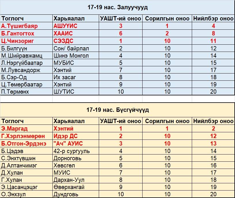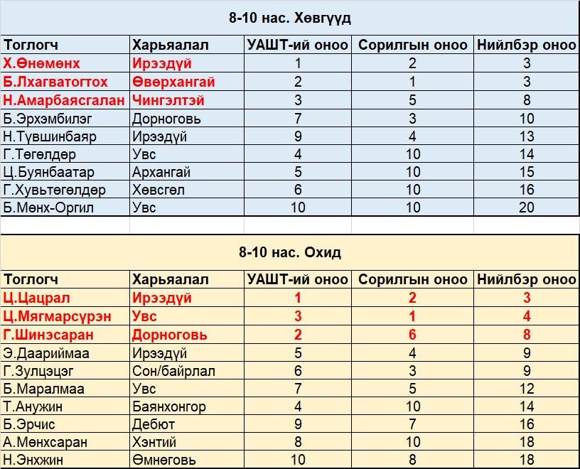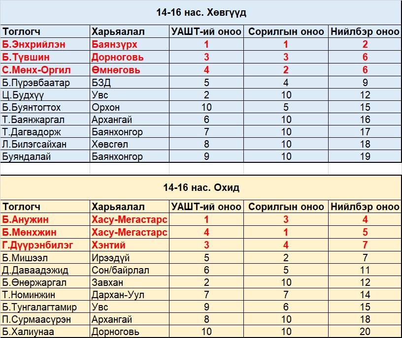 Дүн гарахад залуучуудын ангилалд эрэгтэйчүүдээс А.Түшигбаяр, Б.Гантогтох, Ц.Чинзориг, эмэгтэйчүүдээс Э.Маргад, Г.Хэрлэнмөрөн, Б.Отгон-Эрдэнэ нар УАШТ болон сорилго тэмцээний нийлбэр дүнгээр эхний гурван байрт шалгарч, ДАШТ-д оролцох болзлоо биелүүлсэн байна. Харин өсвөрийн 8-10 насны ангилалд хөвгүүдээс Х.Өнөмөнх, Б.Лхагватогтох, Н.Амарбаясгалан, охидоос Ц.Цацрал, Ц.Мягмарсүрэн, Г.Шинэсаран, 11-13 насны ангилалд хөвгүүдээс Б.Сүхбат, А.Дашчирэв, С.Болор, охидоос Э.Хүслэн, Б.Есүй, Н.Налжормаа, 14-16 насны ангилалд хөвгүүдээс Б.Энхрийлэн, Б.Түвшин, С.Мөнх-Оргил, охидоос Б.Анужин, Б.Мөнхжин, Г.Дүүрэнбилэг нар шалгарлаа.