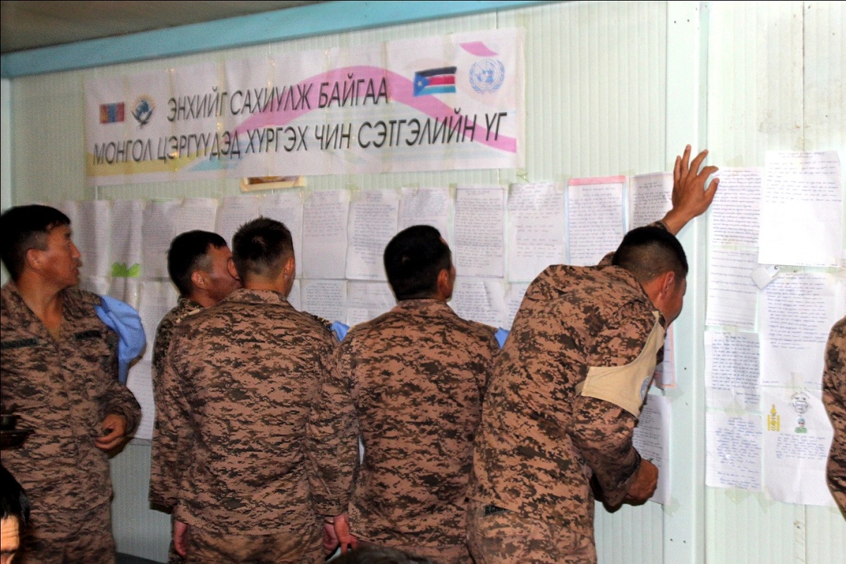 Зэвсэгт хүчний Жанжин штаб, Нийслэлийн Засаг даргын Тамгын газар, Нийслэлийн Боловсролын газраас “Олон улсын энхийг сахиулагчдын өдөр”-ийг тохиолдуулан ерөнхий боловсролын сургуулиудын ахлах ангийн сурагчдын дунд “Энхийг сахиулж байгаа Монгол цэргүүдэд хүргэх чин сэтгэлийн үг” ил захидлын аяныг өрнүүлсэн. БНӨСУ-д НҮБ-ын UNMISS ажиллагаанд үүрэг гүйцэтгэж байгаа Монгол Улсын Зэвсэгт хүчний мотобуудлагын батальоны VIII ээлжийн энхийг сахиулагчдад зургаан дүүргийн 24 сургуулийн дунд болон ахлах ангийн сурагчдын илгээсэн 750 гаруй ил захидлыг хүлээн авч, Хубилай, Арвай, Эко баазуудад үүрэг гүйцэтгэж байгаа ах эгч нар нь та бүхний бичсэн чин сэтгэлийн үгтэй ил захидлыг уншин танилцаж үүрэг гүйцэтгэж байгаа цэргийн алба хаагчдын хүүхдүүд, дүү нараас нь ирсэн ил захидлыг хүлээлгэн өглөө.