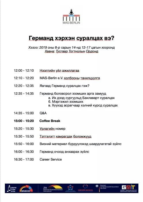 Тусгаар тогтнолын ордонд Берлин дахь Монголын мэргэжил эзэмшигч болон оюутны холбооноос ХБНГУ-д суралцах сонирхолтой залууст зөвлөгөө өгөх "Германд хэрхэн суралцах вэ?" өдөрлөг зохион байгуулна.