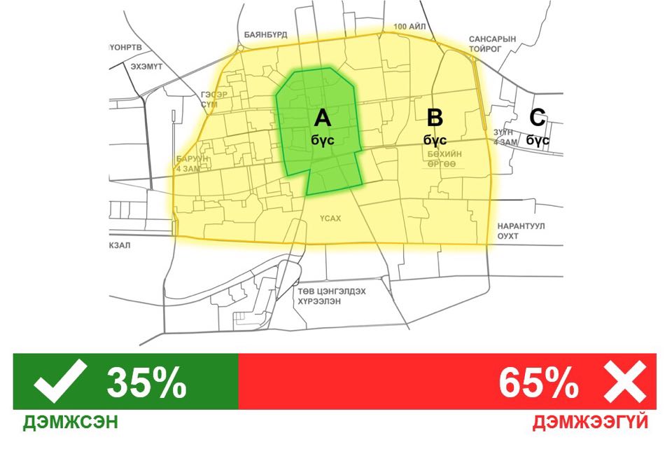А болон В бүс рүү татвараа төлсөн, торгуульгүй, өнгө үзэмж сайтай, техникийн улсын үзлэгт тэнцсэн автомашинуудыг нэвтрүүлэхээр төлөвлөж байсан юм. Тэгвэл A, B, C бүсчлэлд хуваах төслийн талаар санал асуулга явуулахад иргэдийн 36% дэмжиж, 64% дэмжээгүй учраас иргэдийн саналын харгалзан төлөвлөж байсан ажлыг тодорхой хугацаагаар хойшлуулсан байна.