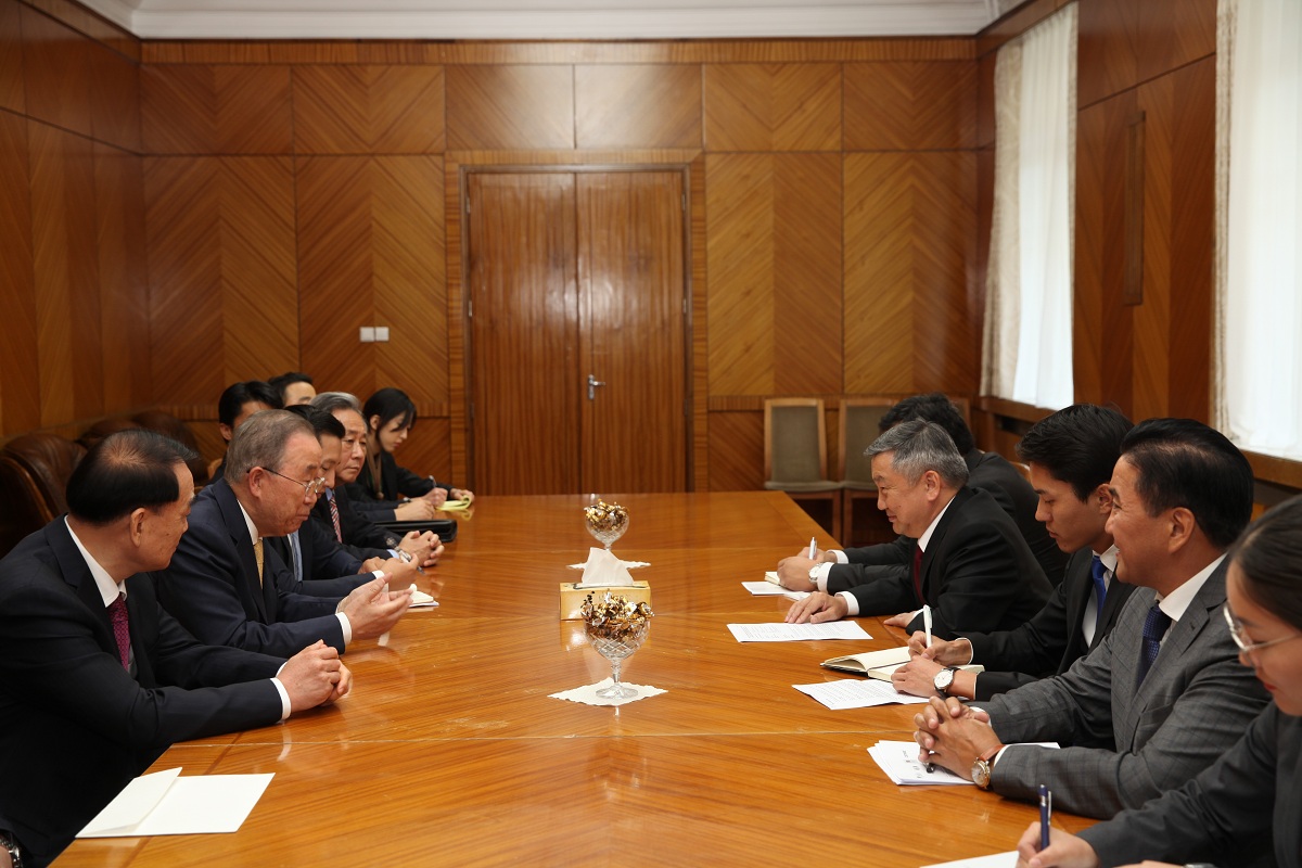 Монгол Улсад зохион байгуулагдаж буй “Азийн төлөөх Боао форум”-ын Улаанбаатарын Бага хуралд оролцохоор хүрэлцэн ирсэн форумын дарга, НҮБ-ын Ерөнхий нарийн бичгийн дарга асан Бан Ги Мүн тэргүүтэй төлөөлөгчдийг Монгол Улсын Ерөнхийлөгчийн Тамгын газрын дарга З.Энхболд /2019.0820/ хүлээн авч уулзлаа.