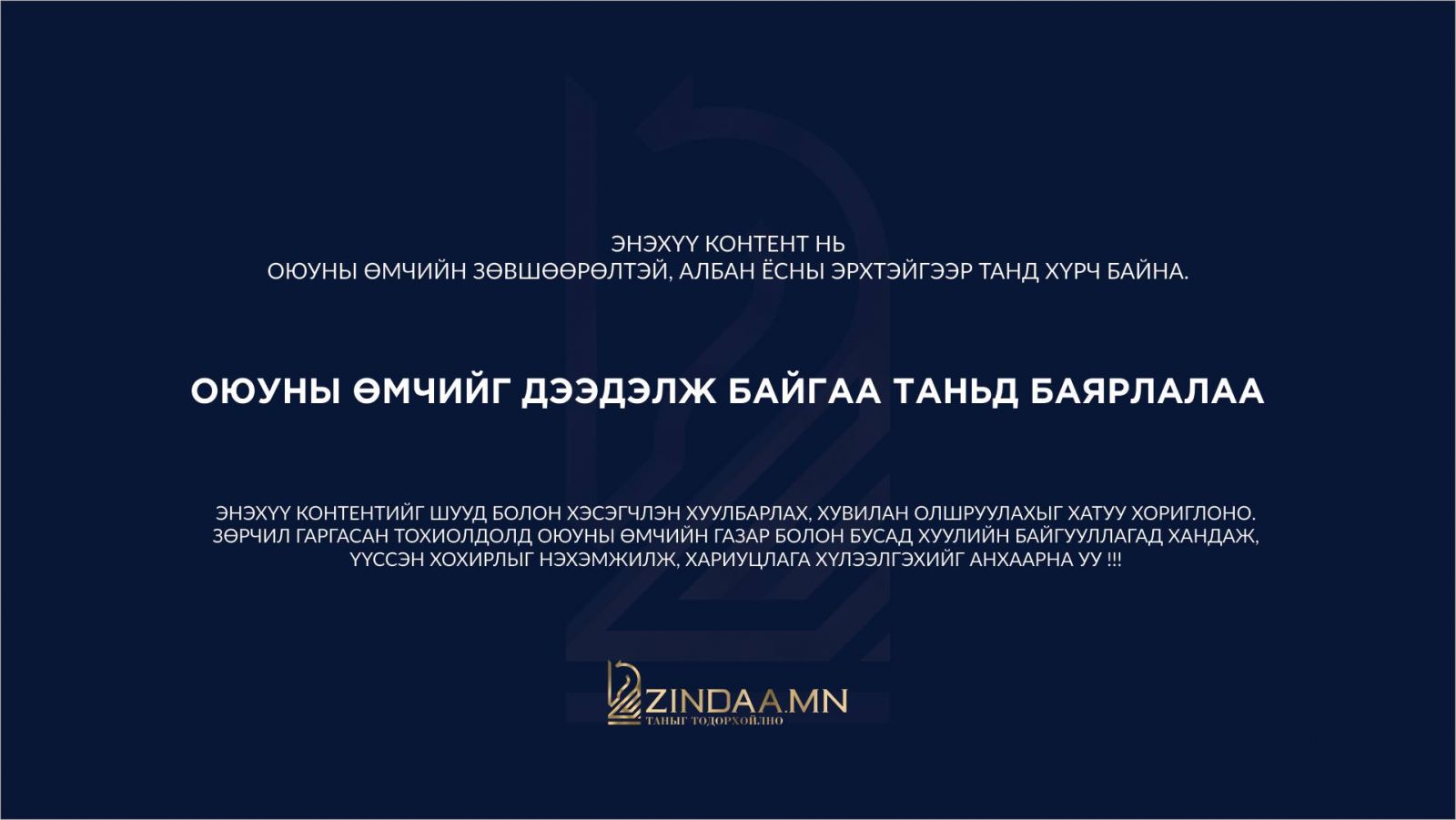 Монгол Улсад орчин цагийн тагнуулын байгууллага үүсч, байгуулагдсаны 100 жилийн ойд зориулан ZINDAA.MN сайт тагнуулын байгууллагын архив, түүхт үйл явдал, зохиолд тулгуурлан “АУДИО | ТАГНУУЛ - 100 ЦУВРАЛ” төслийг хүргэж байна. Бид энэхүү цувралаар Аудио зохиолын 100 сонирхолтой бүтээлийг уншигч, сонсогч танд хүргэх болно.
