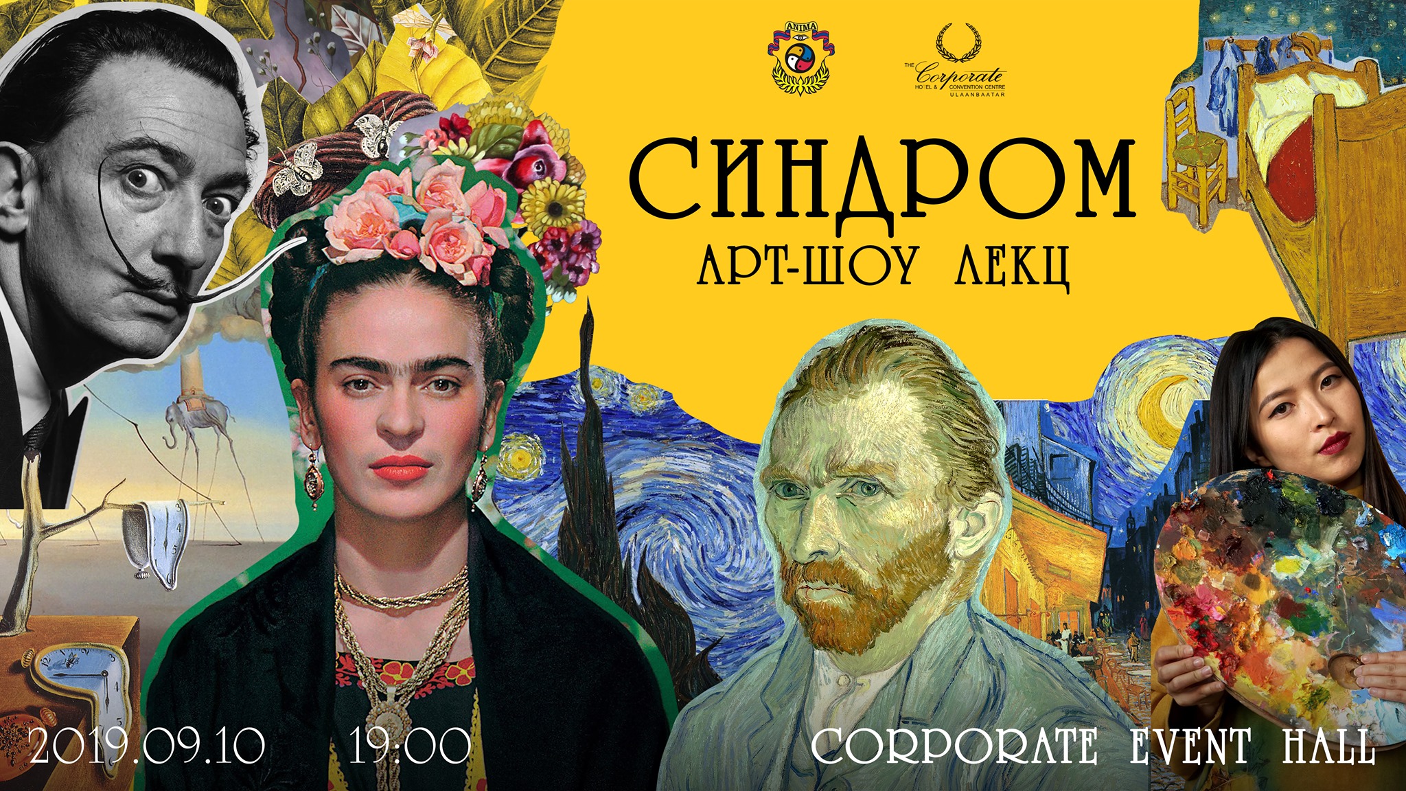 Ван Гог, Сальвадор Дали , Фрида Кало гэх мэт суут зураачдын сод бүтээлүүдийн тухай урлагийн түүхийн уйдаахгүй, унтуулахгүй лекцээс гадна жинхэнэ урлагийн шоу үзүүлбэр бүхий өвөрмөц арга хэмжээнд урлаг, дүрслэх урлаг сонирхогч, оюунлаг та бүхнийг урьж байна .