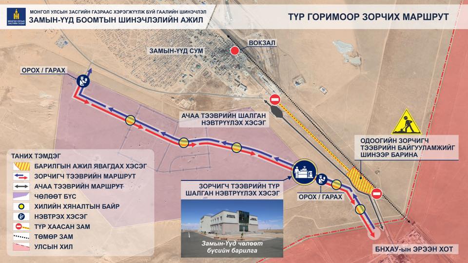 Энэ хугацаанд суудлын болон УАЗ автомашинаар зорчигчид хуучин боомтын баруун хойд талд байрлах Замын-Үүд чөлөөт бүсийн зам талбайгаар нэвтэрнэ. Түр горимоор зорчих маршрут болон түр байгууламжуудын байршлын зургийг танилцуулж байна.