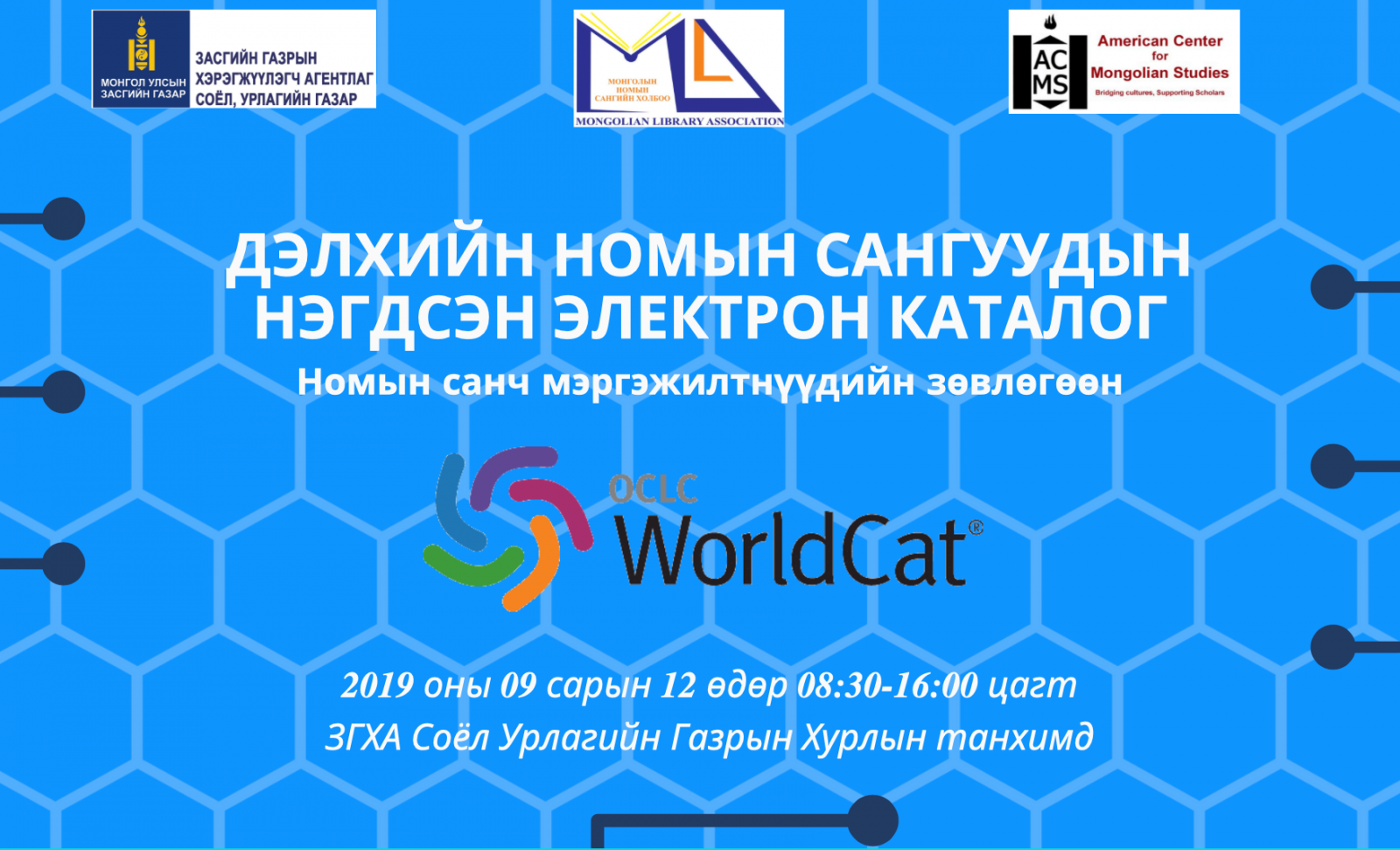 Засгийн газрын хэрэгжүүлэгч агентлаг Соёл, урлагийн газар, Монголын номын сангийн холбоо, Америкийн монгол судлалын төв хамтран “Oclc Worldcat- Дэлхийн номын сангуудын нэгдсэн электрон каталог” номын санч мэргэжилтнүүдийн зөвлөгөөнийг есдүгээр сарын 12 өдрийн 08:30-16:00 цагт зохион байгуулж байна.