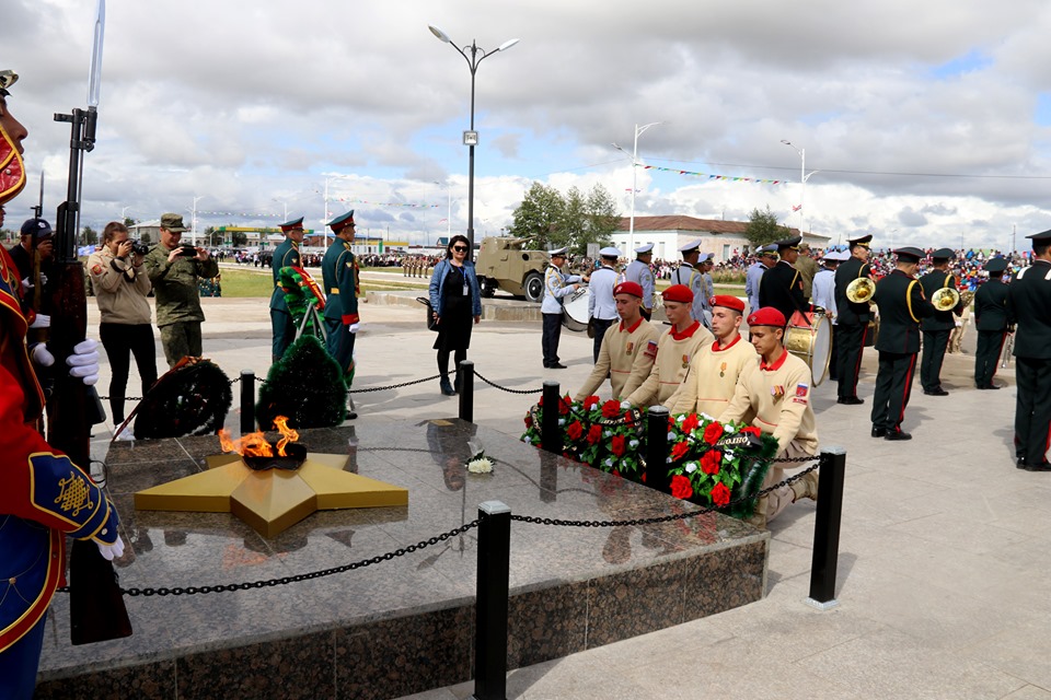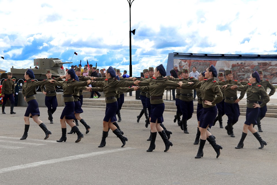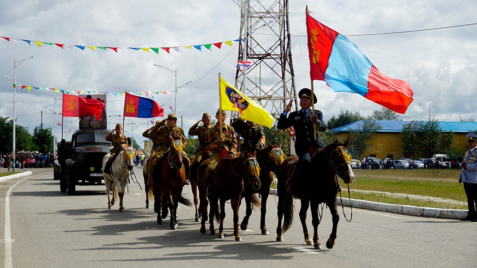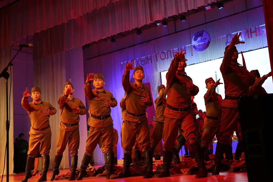 Монгол Улсын тусгаар тогтнолын төлөө Халхын голын дайнд баатарлагаар амь үрэгдсэн ахмад дайчдын үр хүүхэд, төрөл төрөгсдийн жагсаал, “Спасибо Россия” хэмээх талархлын уриатай Дорнод аймгийн Залуучуудын жагсаал, зүүн бүсийн цэрэгжилт спортын “Дөл” тоглолтын шилдэг оролцогчид “Өсвөрийн эх орончид”, ОХУ-ын Өвөр байгалийн хязгаарын Чита хотын ерөнхий боловсролын сургуулийн сурагчдын төлөөлөл, “Өсвөрийн арми” бүлгийн сурагчдын жагсаал, “Дайчин алдрын замаар” аялалд оролцсон дугуйчдын жагсаал, Төв аймгийн Мөнгөнморьт сумаас оролцож буй морьтон хүүхдүүдийн жагсаал, Халхын голын дайнд оролцож байсан авто машин техник хэрэгслийг сэргээн засварлах уралдааны 1-3 дугаар байр эзэлсэн авто машин сонирхогчдын авто машины жагсаалаар үргэлжилсэн юм. Хүндэтгэлийн жагсаалын дараагаар Монгол улсын цэргийн дуу бүжгийн чуулга, Оросын Холбооны улсын Өвөрбайгалийн хязгаарын Чита хотын Цэргийн дуу бүжгийн чуулга, Дорнод аймгийн Хөгжимт драмын театрын уран бүтээлчид, аймгийн Ерөнхий боловсролын сургуулийн сурагчдын хамтарсан урлагийн тоглолтоор ирсэн зочдодоо мэндчилгээ дэвшүүллээ.
