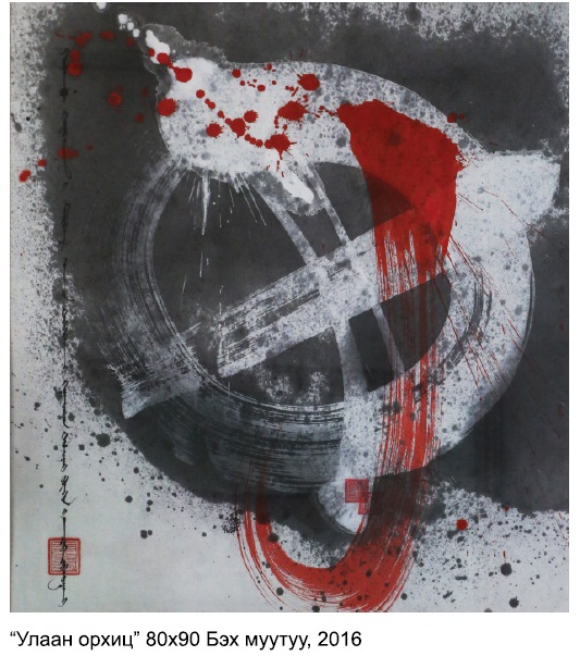-Энэ бол “Улаан орхиц” гэдэг нэртэй каллиграф. Ер нь уран бүтээл хийхдээ маш олон талаас нь бодож, аль болох лавшруулж даяаршуулж хиймээр санагддаг. Энд “МНТ-ны хасаг тэрэгнээс дээш гарсан толгой бүхнийг цавчсугай” гээд хорсохдоо олон мянган хүнийг хүйс тэмтэрсэн түүхийг өгүүлсэн юм. Чингис хааны тэр үйлдлийг бид сайн, муу гэж өнөөдөр дүгнэх эрхгүй. Байсан юмыг байгаагаар нь тавих ёстой. Тэгэхийн тулд яаж уран бичлэгтэй холбох вэ? гэж бодсон. Монгол бичгийн үндсэн зурлага титэм, шүд, шилбэ, гэдэс, нум, сүүл, орхиц. Тэр орхиц бол түүхэнд үлдсэн орхиц. Гэхдээ тэр нь улаан орхиц, хасаг тэрэгний мөөрөн каллиграф.