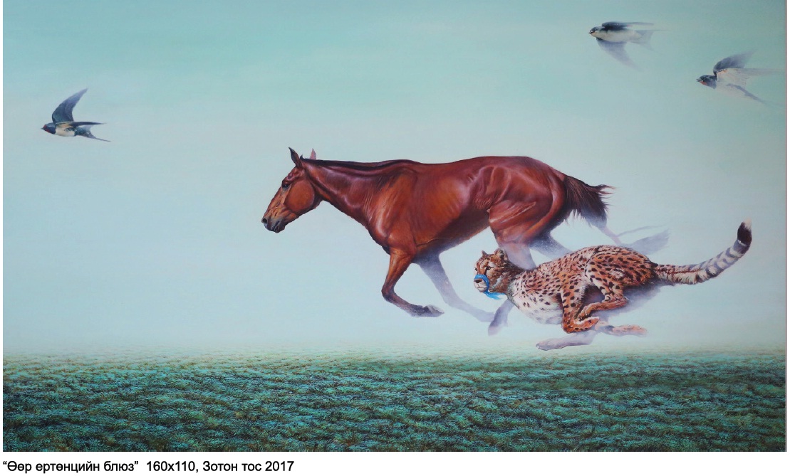-Монгол даяараа алдартай Ононгийн хээр. Одоо бол байхгүй. Миний хувьд, хурдан морийг хажуудаа билэгдэлтэй зурах санаа эндээс анх үүдэж зурагдсан. Энэ бол “Өөр ертөнцийн блюз” гэдэг зураг. Яагаад өөр ертөнц гэхээр морь тэнгэрт гарчихаараа тэндээ эрх чөлөөгөө олж хазааргүй, эрх чөлөөтэй, шувуудтайгаа уралдаад л... Хажууд нь давхиж яваа нь хуурай газрын хамгийн хурдан амьтан болох Африкийн үчинбэр. Заавал Монголд байдаг амьтан байх ёстой гэсэн сэтгэлгээ байхгүй шүү дээ. Цаад логик утгаараа тэр хоёр өөр ертөнцөд уралддаг ч юм билүү. Нөгөө утгаараа морины хурдыг, амьтан хөөгөөд хөдлөхөөрөө 120 км цаг хурдалдаг үчинбэрийн хурдтай зүйрлэсэн юм.