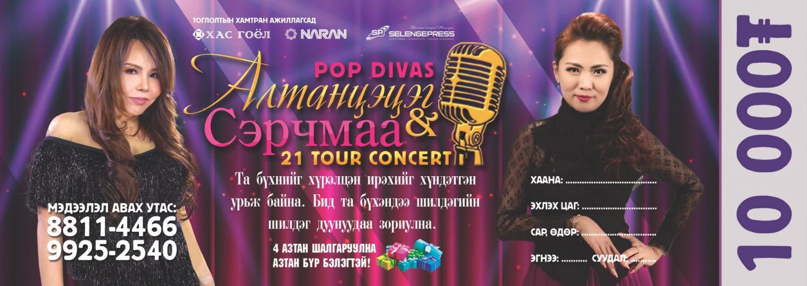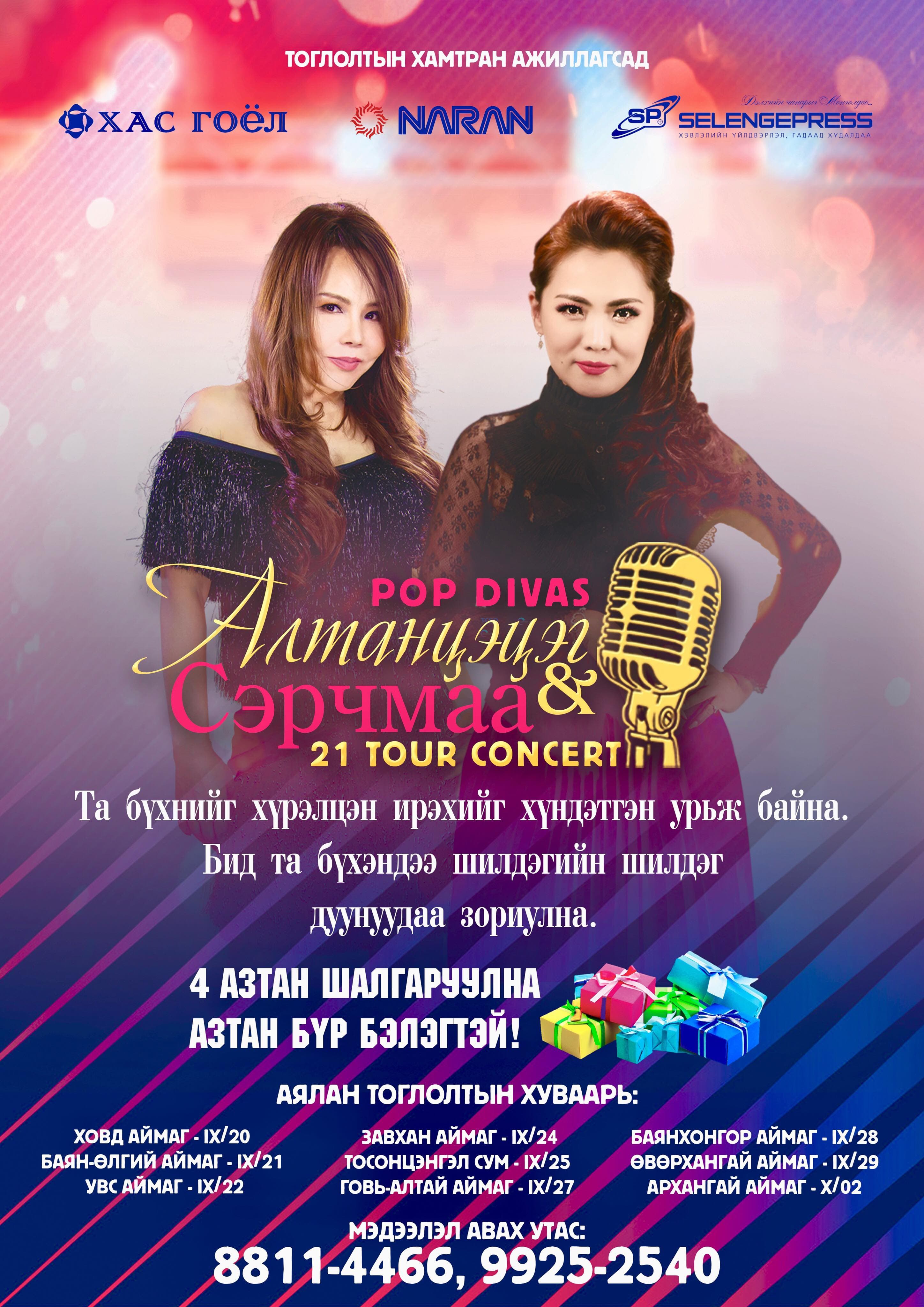 Поп дива тодотголтой дуучид болох Монгол Улсын Гавьяат жүжигчин, дуучин Ж.Алтанцэцэг, Соёлын тэргүүний ажилтан дуучин С.Сэрчмаа нарын хамтарсан “Altaa & Sally-21” нэртэй аялан тоглолт хийхээр болжээ.