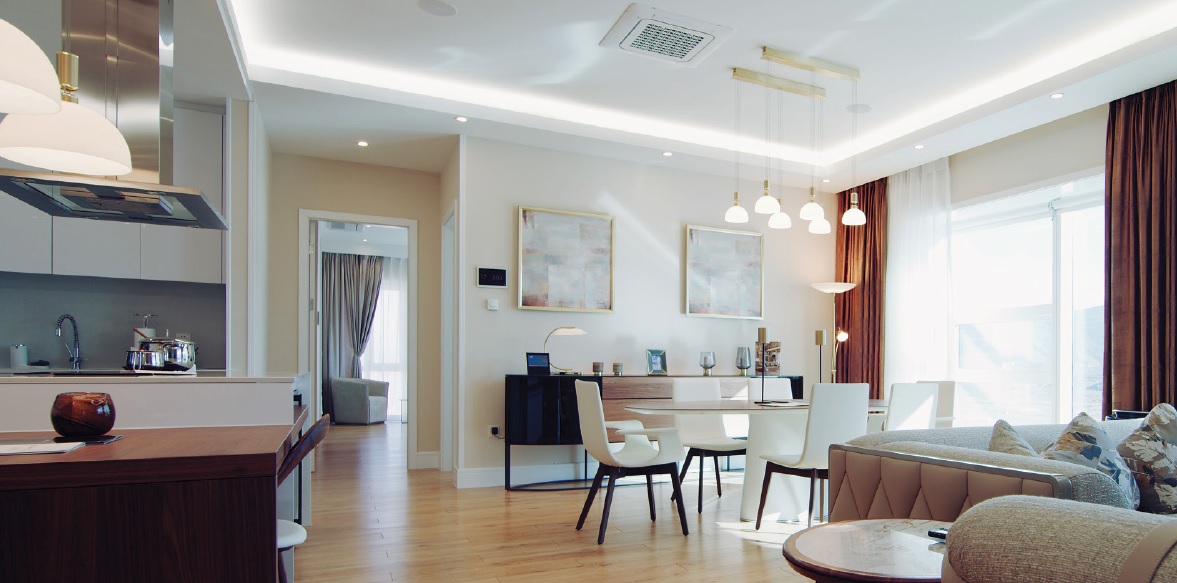 Айлчин гийчдийн тухлан саатах зочны өрөөний хувьд шалнаасаа тааз хүртлээ шилэн фасадтай бөгөөд бусад орон сууцтай харьцуулахад илүү өндөр таазтай байхаар төлөвлөсөн нь өрөөг илүү зайтай, саруул болгож өгсөн байв. Тус байрнуудын ханы өндөр 4,0 метр учраас байгалийн гэрэл чөлөөтэй нэвтэрч буй нь тансаг орчин, тав тухын дээдийг сэтгэл ханатал мэдрүүлэхүйц болж чаджаа.