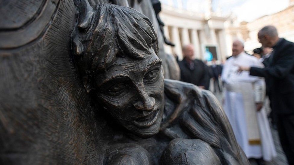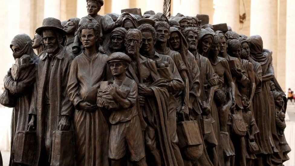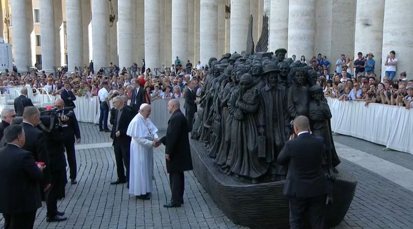 Ватиканы Гэгээн Питерийн талбай дээр Ромын Пап Франсис дэлхий дээрх дүрвэгч, цагаачдад зориулсан хөшөөг албан ёсоор нээжээ. “Үл мэдэгдэх сахиусан тэнгэр” нэртэй энэхүү хөшөө нь Гэгээн Питерийн талбай дээр сүүлийн 400 жилд анх удаа босгосон хөшөө юм. Нацист Германаас дүрвэж буй еврейгээс авхуулаад иргэний дайнаас зугтаж буй Сирийн дүрвэгч хүртэл нийт 140 дүрвэгч, цагаачдыг дүрсэлсэн энэхүү бүтээл гурван тонн жинтэй.