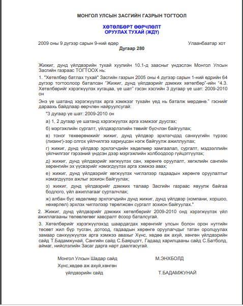 “Жижиг, дунд үйлдвэрийг дэмжих хөтөлбөр”-ийг Засгийн газрын 2005 оны дөрөвдүгээр сарын 1-ний өдрийн 64 дүгээр тогтоолоор баталж байжээ. Харин уг хөтөлбөрийн 4. 3-т заасан “Хөтөлбөрийг хэрэгжүүлэх хугацаа, үе шат” гэсэн хэсгийн 3 дугаар үе шатыг 2009-2010 онд тогтоож, хэрэгжүүлэх тухай өөрчлөлтийг 2009 оны есдүгээр сард Хүнс,хөдөө аж ахуй,хөнгөн үйлдвэрийн сайд Т.Бадамжунай, Монгол Улсын Шадар сайд М.Энхболд нар тогтоолоор баталж, хөтөлбөрийг хэрэгжүүлэхэд шаардагдах хөрөнгийг улсын болон орон нутгийн төсөвт жил бүр тусган, дотоод, гадаадын хөрөнгө оруулагчдыг татан оролцуулах замаар санхүүжүүлэх арга хэмжээ авахыг Хүнс, хөдөө аж ахуй, хөнгөн үйлдвэрийн сайд Т.Бадамжунай, Сангийн сайд С.Баярцогт, Гадаад харилцааны сайд С.Батболд, аймаг, нийслэлийн Засаг дарга нарт даалгасугай гэж шийдвэрлэж байжээ.