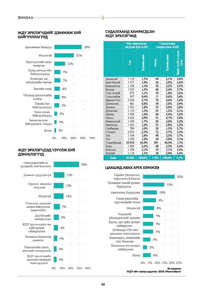 Түүвэр судалгаанд 2018 оны эцсийн байдлаар Үндэсний Статистикийн Хорооны Бизнес регистрийн санд бүртгэлтэй үйл ажиллагаа явуулж буй 83,086 аж ахуйн нэгжүүдийг хамруулжээ. Статистик тооцооллоос оновчтой түүврийн хэмжээг Улаанбаатар хотоос 1000, аймгуудаас 30-50 буюу нийт 1850 байхаар тусгажээ. Санал асуулгад оролцогчдыг аймаг, нийслэлээр авч үзвэл нийт оролцогчдын 46 хувийг Улаанбаатар хотын, 54 хувийг орон нутгийн ЖДҮ эрхлэгчид эзэлж байгаа бөгөөд хувийн жинг харвал ихэнх аймгуудад 2-3 хувийн хооронд жигд тархалттайгаар хамрагдсан гэж Монголбанкнаас мэдээлж байгаа юм.