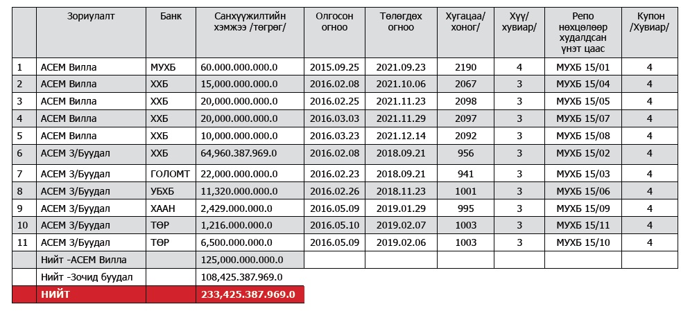 “АСЕМ Вилла” цогцолбор хотхон төслийг хэрэгжүүлэх, зочид буудлуудад хөнгөлөлттэй зээл олгоход шаардлагатай хөрөнгийн эх үүсвэрийг шийдвэрлэх талаар Засгийн Газраас 226, 331 болон 334 дүгээр тогтоолуудыг тус тус гаргажээ. Засгийн газрын хэрэг эрхлэх газраас Хөгжлийн банкнаас гаргах үнэт цаасыг мөнгөжүүлж ажиллахыг Монголбанкнаас хүссэн албан бичгийн дагуу Монголбанк дээрх арга хэмжээг барьцаат зээл болон урт хугацаат репо санхүүжилтийн арга хэрэгсэл ашиглан санхүүжүүлж, “АСЕМ”-ын арга хэмжээний хүрээнд түнш зочид буудлуудад нийт 108.4 тэрбум төгрөг, “АСЕМ Вилла” цогцолбор төсөлд нийт 125.0 тэрбум төгрөгийн санхүүжилт олгожээ. Нийтдээ 233 тэрбум 425 сая 387 мянган төгрөг олгосон байдаг аж. Харин уг репо санхүүжилтийн эргэн төлөлт 2018 оны есдүгээр сарын 21- ний өдрөөс 2021 оны арванхоёрдугаар сарын 14-ний өдрийн хооронд хийгдэхээр төлөвлөгдсөн байгаа юм. Тухайлбал, 2018 оны есдүгээр сарын 21-ний өдөр 86 тэрбум төгрөгийн эргэн төлөлт, арваннэгдүгээр сарын 23-нд 11 тэрбум 320 сая төгрөгийн эргэн төлөлт хийгдсэн байх ёстой юм. Эргэн төлөгдсөн эсэх нь одоогоор тодорхой бус байна.
