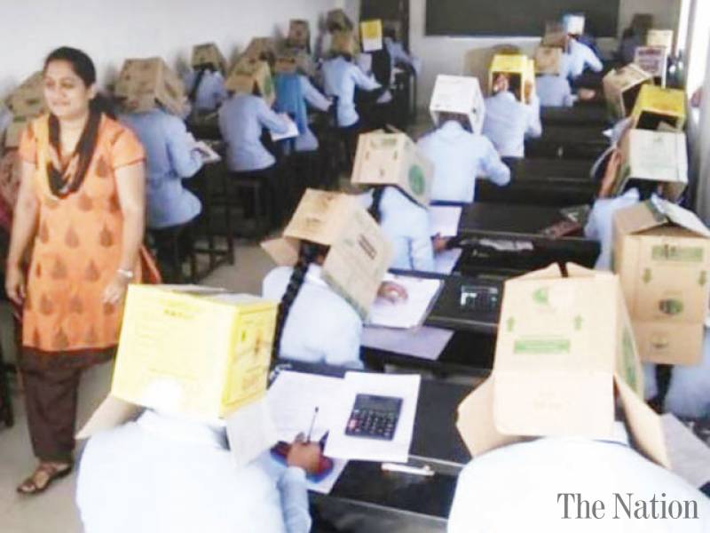 Энэтхэгийн Карнатака мужийн нийслэл Бенгалуру /Бангалор/ хотын Бхагат коллеж 50 орчим оюутныхаа толгойд цаасан хайрцаг углан, шалгалт авчээ.