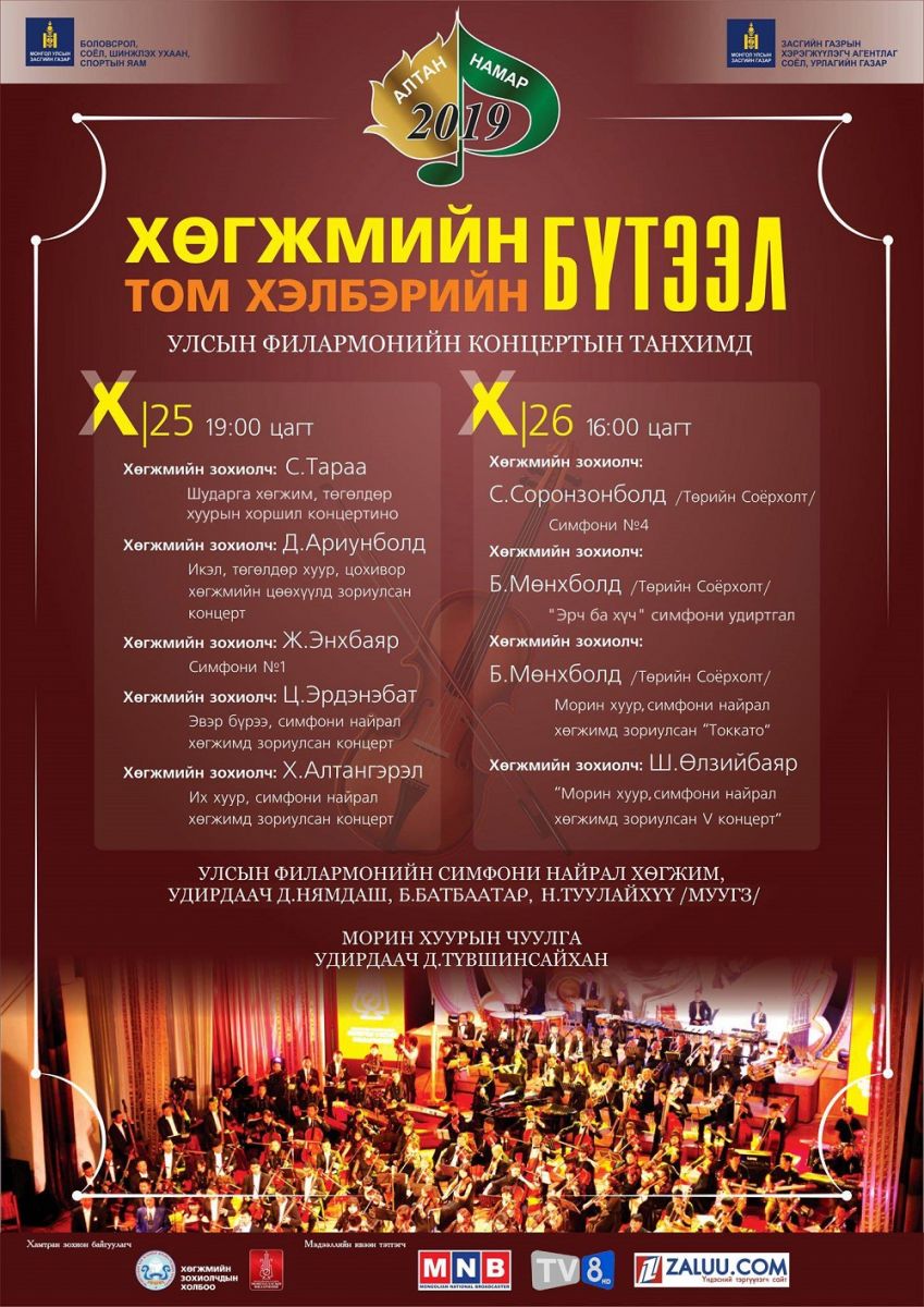 Энэ жил “Алтан намар" хөгжмийн наадам аравдугаар сарын 25, 26 ны өдрүүдэд Улсын Филармонийн концертын танхимд зохион байгуулах бөгөөд дор дурьдсан хөгжмийн зохиолчдын хөгжмийн том хэлбэрийн бүтээлүүд эгшиглэх юм.