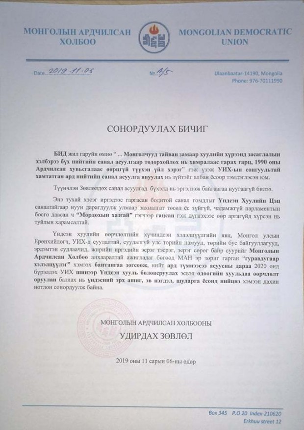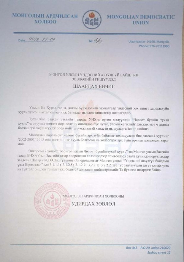 МоАХ-ны УЗ-өөс өнөөдөр /2019.11.06/ Оюутолгойн гэрээ, Үндсэн хуулийн нэмэлт, өөрчлөлт, чөлөөт бүсийн асуудлаар байр сууриа илэрхийллээ. МоАХ-ныхон Монгол Улсын Үндэсний аюулгүй байдлын зөвлөл /ҮАБЗ/-ийн гишүүдэд хандан Оюутолгойн гэрээтэй холбогдуулан мэдэгдэл хүргүүлсэн бөгөөд чөлөөт бүстэй холбоотойгоор шаардах бичиг, Үндсэн хуулийн нэмэлт, өөрчлөлттэй холбоотойгоор сонордуулах бичиг гаргаснаа танилцуулсан юм.
