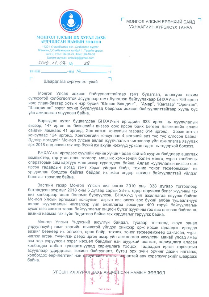УИХ дахь АН-ын зөвлөлөөс Монгол Улсын Ерөнхий сайдад шаардлага хүргүүлжээ. Шаардлагад "Монгол Улсад зохион байгуулалттайгаар цахим сүлжээтэй холбогдолтой асуудлаар гэмт бүлэглэл байгуулахаар БНХАУ-ын 799 иргэн Улаанбаатар хотын нэр бүхий зочид буудлуудад байрлаж, зохион байгуулалттайгаар хууль бус үйл ажиллагаа явуулсан байна. Иймд Монгол Улсын Үндэсний аюулгүй байдал, тусгаар тогтнолд аюул занал учруулахуйц гэмт хэргийн шинжтэй үйлдэл хийхээр орж ирсэн гадаадын иргэдэд визийг бөөнөөр нь олгосон, орон байр, техник, тоног төхөөрөмжөөр хангасан, үүрэг чиглэл өгсөн, түүнчлэн дээрх иргэд ямар үйл ажиллагаа явуулсан, манай улсад ямар гэм хор учруулсан зэрэг нөхцөл байдлыг нэн шуурхай шалгах, хариуцлага алдсан холбогдох албан тушаалтнуудад хариуцлага тооцох, Гадаадын иргэн харьяатын асуудлаар удирдлага, зохион байгуулалт, бүтэц эрх зүйн орчинг дахин нягталж, холбогдох өөрчлөлтийг нэн даруй хийх ажлыг яаралтай авч хэрэгжүүлэхийг шаардаж байна" гэжээ.