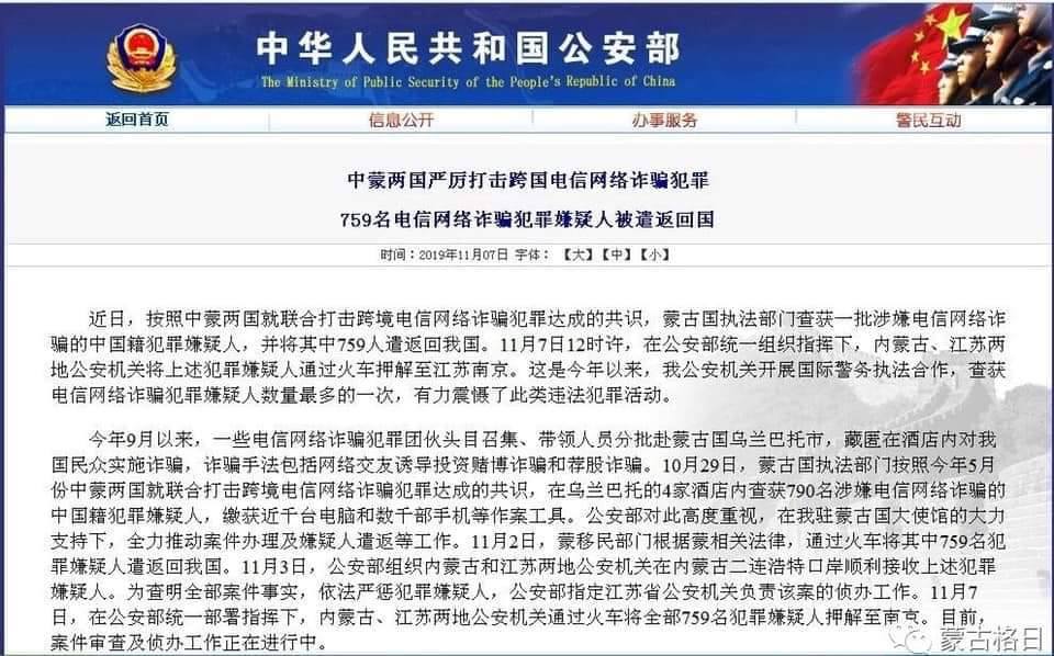 Энэ дагуу нийт 759 хятад иргэнийг УБТЗ-ын тусгай галт тэргээр нутаг буцаасан бөгөөд цагдаагийн байгууллагын алба хаагчид эдгээр иргэдийг харгалзаж, БНХАУ-ын Эрээн хот дахь цагдаагийн байгууллагад хүлээлгэж өгсөн. Улмаар БНХАУ-ын цагдаагийн газраас эдгээр иргэдийг шалгаж, эрүүгийн хэрэгт татан, Нанжин хотын шоронд хорихоор болсон байна.