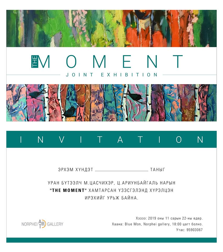 "Moment" үзэсгэлэн 2019 оны арваннэгдүгээр сарын 22ны 18:00 цагаас нээлтээ хийж арванхоёрдугаар сарын 1 хүртэл Bluemon center-ийн 1-р давхарт байрлах Norphei Art Gallery-д гарах юм.