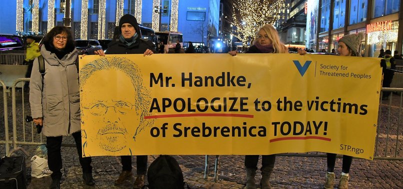 Үүнтэй зэрэгцэн Хандкед Нобелийн шагнал гардуулахыг эсэргүүцэн Стокхольм хотноо мягмар гарагийн орой эсэргүүцлийн жагсаал болжээ. Нобелийн хорооны дарга Нобелийн шагнал улс төрөөс ангид бөгөөд шагнал хүртэгсдийн улс төрийн үзэл бодлыг үл харгалзан уран зохиолын салбарт гаргасан амжилтынх нь төлөө хүртээдэг гэж мэдэгдэж байсан юм.