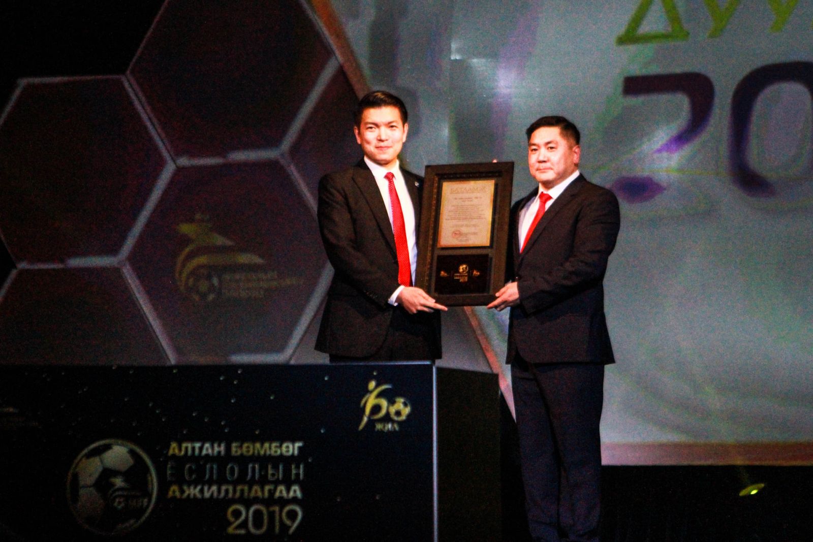 - Хөлбөмбөгийн спортыг олон нийтэд хүргэх, хүүхэд багачуудыг эрүүл чийрэг, багаар ажиллах чадвартай, бие даасан хүн болоход чухал нөлөө үзүүлэн ажиллаж, үндэсний шигшээ баг, дээд лигийн тоглогчдыг олноор нь бэлдсэн “Дуулиан 2020” ТББ байгууллага “Алтан бөмбөг” 2019 ёслолын үйл ажиллагааны “Ерөнхийлөгчийн нэрэмжит шагнал”-ыг хүртлээ. 2015-2020 он хүртэл үйл ажиллагаа идэвхтэй, үр дүнтэй явуулсныг нь үнэлж, МХБХ-ны Ерөнхийлөгч А.Ганбаатар "Ерөнхийлөгчийн нэрэмжит" шагналыг гардуулав.