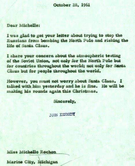 “Санта Клауст санаа зовох хэрэггүй. Би өчигдөр түүнтэй утсаар ярьсан. Тэр сайн байна лээ. Энэ Зул сарын баяраар бэлэг тараахаар аяллаа хийнэ гэсэн” хэмээн Жон Кеннеди 1961 оны аравдугаар сарын 28-ны өдөр бяцхан Мишелл охинд хариу илгээж байжээ. Жон Кеннеди ЗХУ-ын туршилт зөвхөн Хойд туйл төдийгүй дэлхий дахинд, Санта Клаус төдийгүй дэлхийн бүх хүнд аюултай хэмээн охины сэтгэл зовниж байгааг хуваалцаж буйгаа илэрхийлжээ.