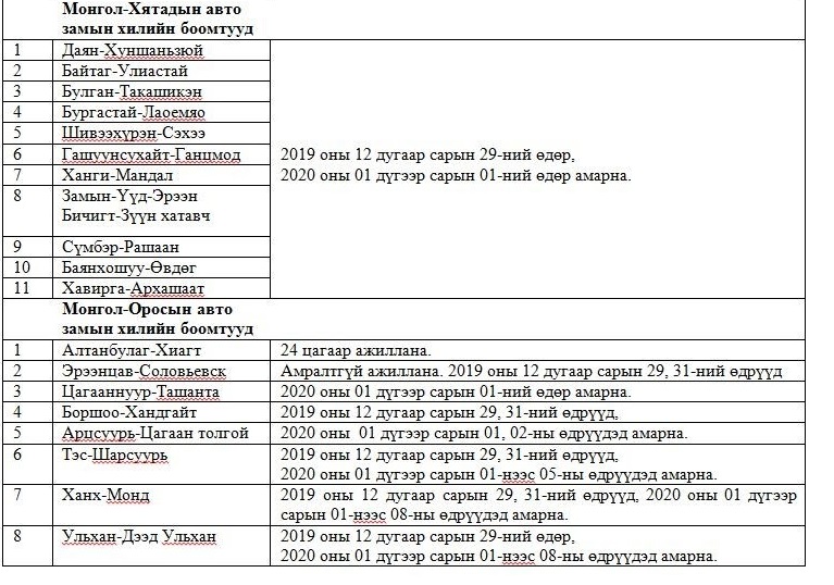 Үндэсний эрх чөлөө, тусгаар тогтнолоо сэргээсний баярын өдөр болон Шинэ жилийн баярын өдрүүдэд хилийн боомтууд амарна. Харин олон улсын нислэг, галт тэрэг цагийн хуваарийн дагуу ажиллах юм. Хилийн боомт тэдгээрийн дэглэмийн тухай хоёр орны Засгийн газрын хэлэлцээрт талуудын хууль ёсны баяр, амралтын өдрүүдэд хилийн боомтыг хаана гэж заасан байна.