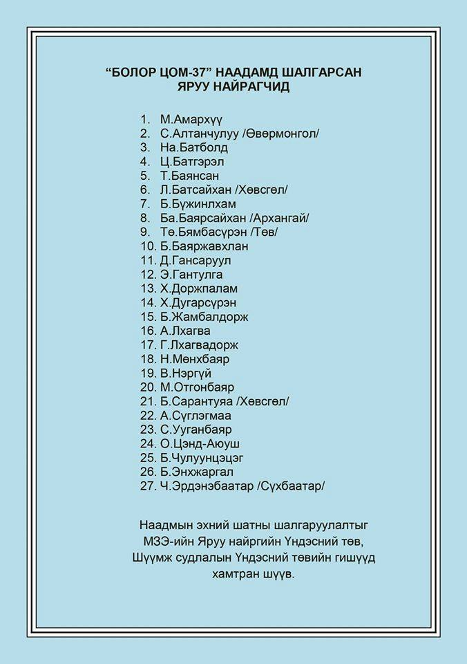 Монголын зохиолчдын эвлэлээс жил бүр уламжлал болгон зохион байгуулж, оны шилдэг яруу найрагчийг тодруулдаг “Болор цом-37” наадмын шилдэг 27 найрагчийн нэрсийг танилцуулъя. 37 дахь удаагаа зохион байгуулагдах гэж буй энэхүү наадамд оролцох найрагчид цаасан дээр бичсэн хоёр шүлгээрээ эхний даваанд өрсөлдсөн юм.